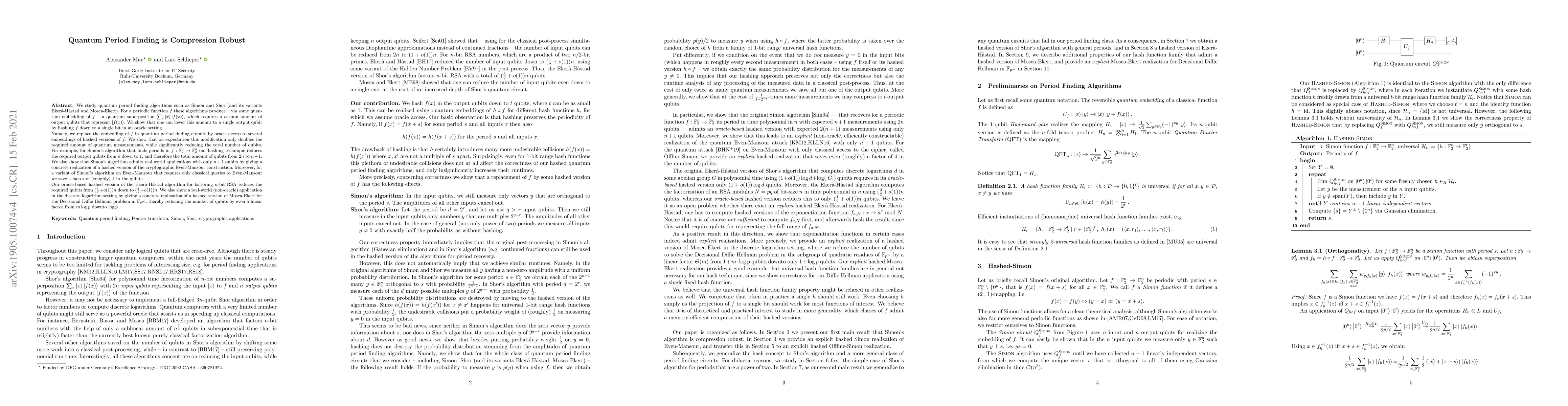 We study quantum period finding algorithms such as Simon and Shor (and its variants Eker{\aa}-H{\aa}stad and Mosca-Ekert). For a periodic function $f$ these algorithms produce -- via some quantum embedding of $f$ -- a quantum superposition $\sum_x |x\rangle|f(x)\rangle$, which requires a certain amount of output qubits that represent $|f(x)\rangle$. We show that one can lower this amount to a single output qubit by hashing $f$ down to a single bit in an oracle setting. Namely, we replace the embedding of $f$ in quantum period finding circuits by oracle access to several embeddings of hashed versions of $f$. We show that on expectation this modification only doubles the required amount of quantum measurements, while significantly reducing the total number of qubits. For example, for Simon's algorithm that finds periods in $f: \mathbb{F}_2^n \rightarrow \mathbb{F}_2^n$ our hashing technique reduces the required output qubits from $n$ down to $1$, and therefore the total amount of qubits from $2n$ to $n+1$. We also show that Simon's algorithm admits real world applications with only $n+1$ qubits by giving a concrete realization of a hashed version of the cryptographic Even-Mansour construction. Moreover, for a variant of Simon's algorithm on Even-Mansour that requires only classical queries to Even-Mansour we save a factor of (roughly) $4$ in the qubits. Our oracle-based hashed version of the Eker{\aa}-H{\aa}stad algorithm for factoring $n$-bit RSA reduces the required qubits from $(\frac 3 2 + o(1))n$ down to $(\frac 1 2 + o(1))n$. We also show a real-world (non-oracle) application in the discrete logarithm setting by giving a concrete realization of a hashed version of Mosca-Ekert for the Decisional Diffie Hellman problem in $\mathbb{F}_{p^m}$, thereby reducing the number of qubits by even a linear factor from $m \log p$ downto $\log p$.