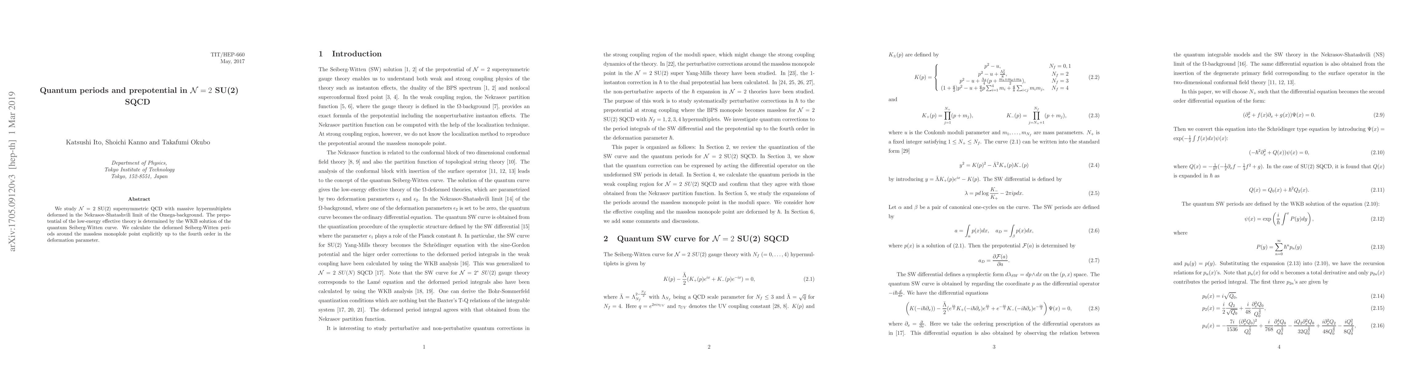 This paper determines the prepotential of ${\cal N}=2$ SU(2) supersymmetric QCD in the Omega-background by calculating the quantum Seiberg-Witten periods up to the fourth order in the deformation parameter, using the WKB approach to the Seiberg-Witten curve. The focus is on the low-energy effective theory and its quantum periods.