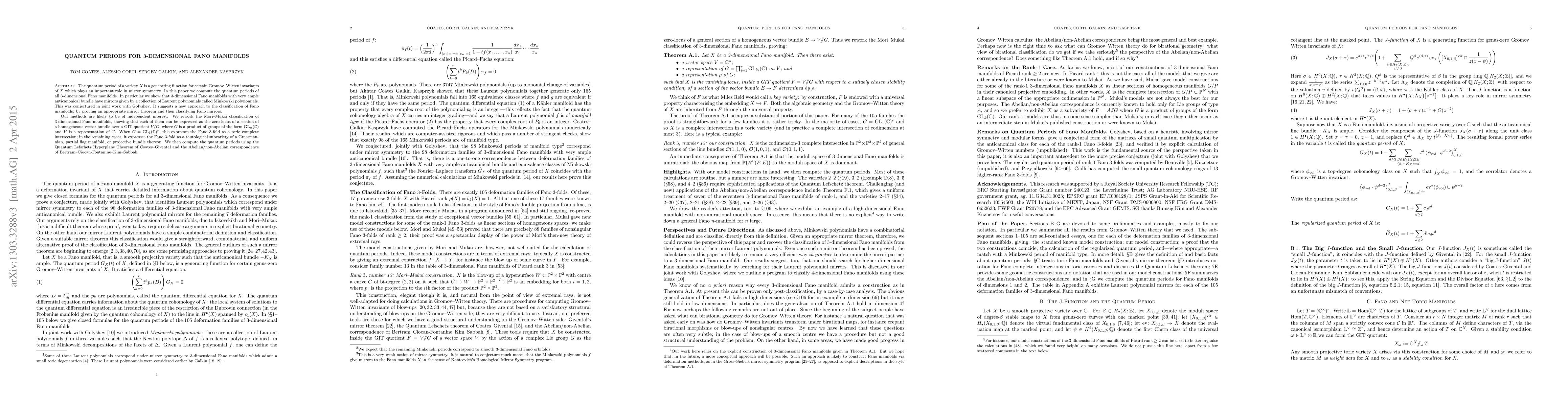 The quantum period of a variety X is a generating function for certain Gromov-Witten invariants of X which plays an important role in mirror symmetry. In this paper we compute the quantum periods of all 3-dimensional Fano manifolds. In particular we show that 3-dimensional Fano manifolds with very ample anticanonical bundle have mirrors given by a collection of Laurent polynomials called Minkowski polynomials. This was conjectured in joint work with Golyshev. It suggests a new approach to the classification of Fano manifolds: by proving an appropriate mirror theorem and then classifying Fano mirrors. Our methods are likely to be of independent interest. We rework the Mori-Mukai classification of 3-dimensional Fano manifolds, showing that each of them can be expressed as the zero locus of a section of a homogeneous vector bundle over a GIT quotient V/G, where G is a product of groups of the form GL_n(C) and V is a representation of G. When G=GL_1(C)^r, this expresses the Fano 3-fold as a toric complete intersection; in the remaining cases, it expresses the Fano 3-fold as a tautological subvariety of a Grassmannian, partial flag manifold, or projective bundle thereon. We then compute the quantum periods using the Quantum Lefschetz Hyperplane Theorem of Coates-Givental and the Abelian/non-Abelian correspondence of Bertram-Ciocan-Fontanine-Kim-Sabbah.