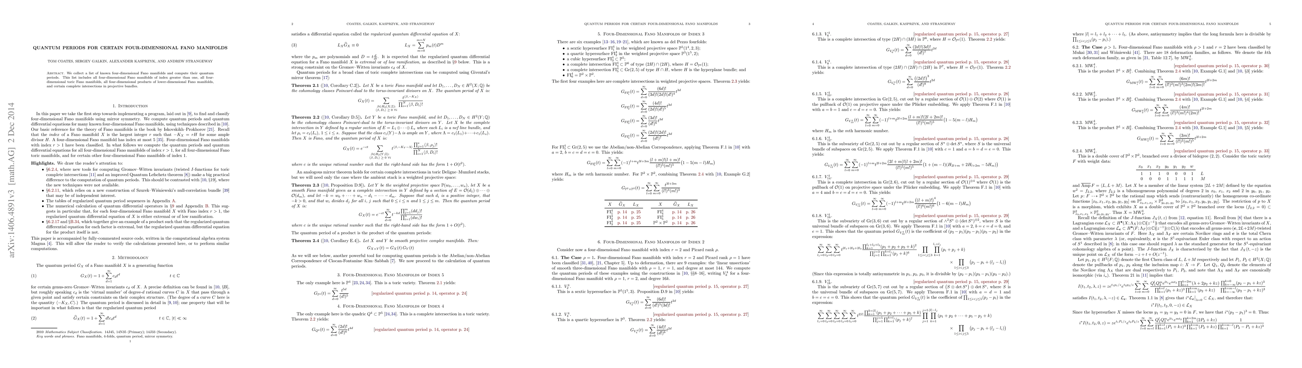 We collect a list of known four-dimensional Fano manifolds and compute their quantum periods. This list includes all four-dimensional Fano manifolds of index greater than one, all four-dimensional toric Fano manifolds, all four-dimensional products of lower-dimensional Fano manifolds, and certain complete intersections in projective bundles.