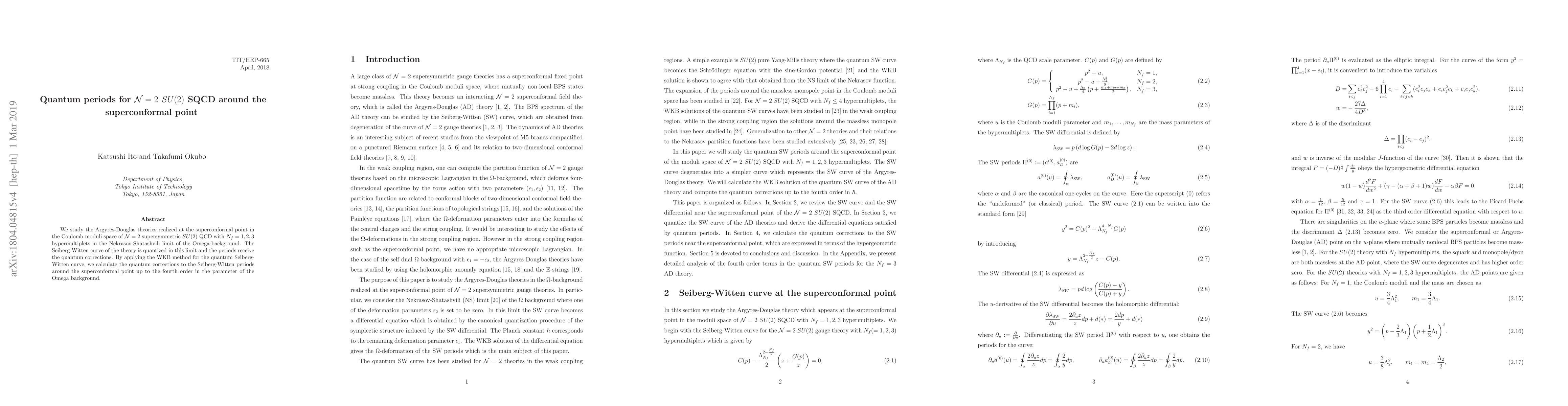 This paper investigates the quantum corrections to the Seiberg-Witten periods of $\mathcal{N}=2$ $SU(2)$ SQCD near the superconformal point, employing the WKB method in the Nekrasov-Shatashvili limit of the Omega-background for $N_f=1,2,3$ hypermultiplets. The study quantizes the Seiberg-Witten curve and computes the quantum period corrections up to the fourth order in the Omega background parameter.