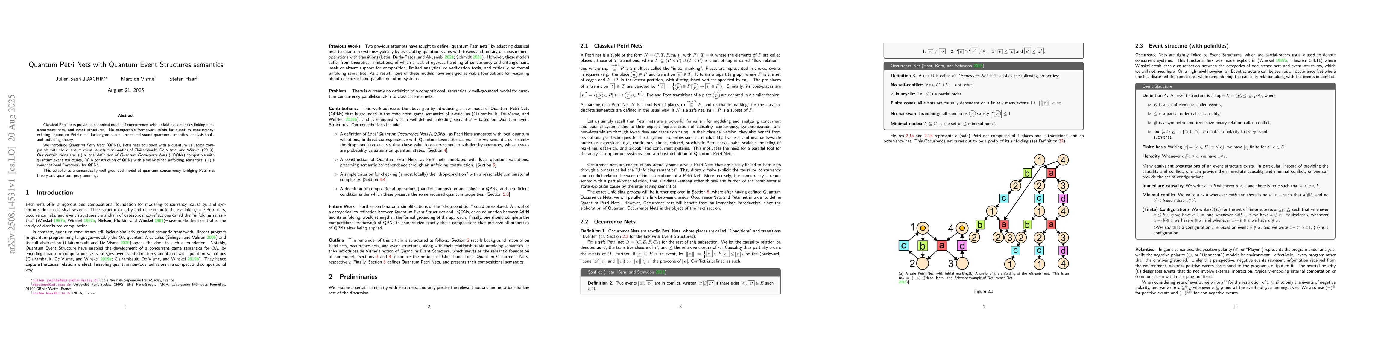 The paper introduces Quantum Petri Nets (QPNs) equipped with a quantum valuation compatible with quantum event structure semantics, providing a local definition of Quantum Occurrence Nets (LQONs) and a construction for QPNs with unfolding semantics.