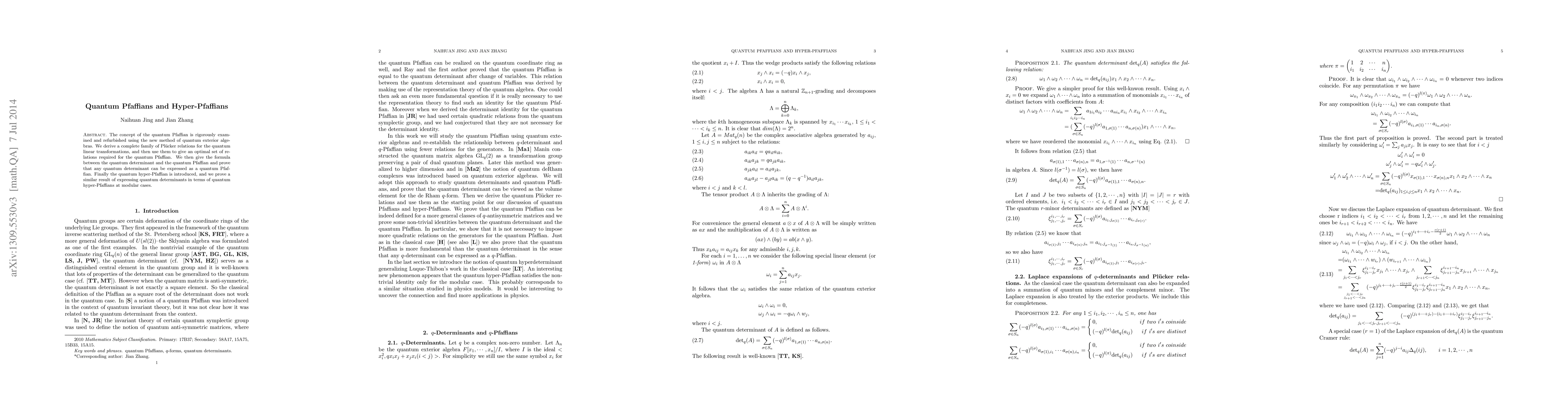 The research rigorously examines and refurbishes the concept of quantum Pfaffians using quantum exterior algebras, deriving Plücker relations for quantum linear transformations, and establishing relations between quantum determinants and Pfaffians.