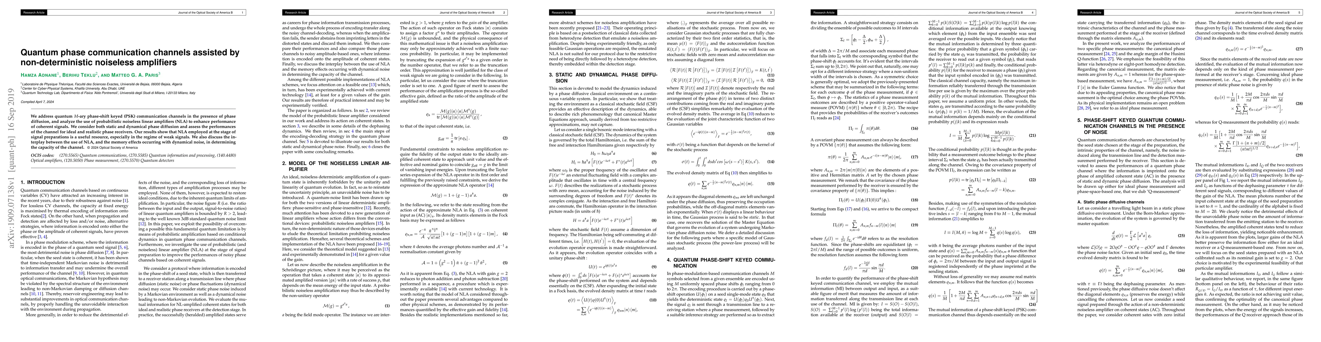 This paper investigates quantum $M$-ary phase-shift keyed communication channels with phase diffusion, exploring the enhancement of coherent signal performance using probabilistic noiseless linear amplifiers. The study finds that these amplifiers are particularly useful for weak signals and discusses the impact of dynamical noise on channel capacity.