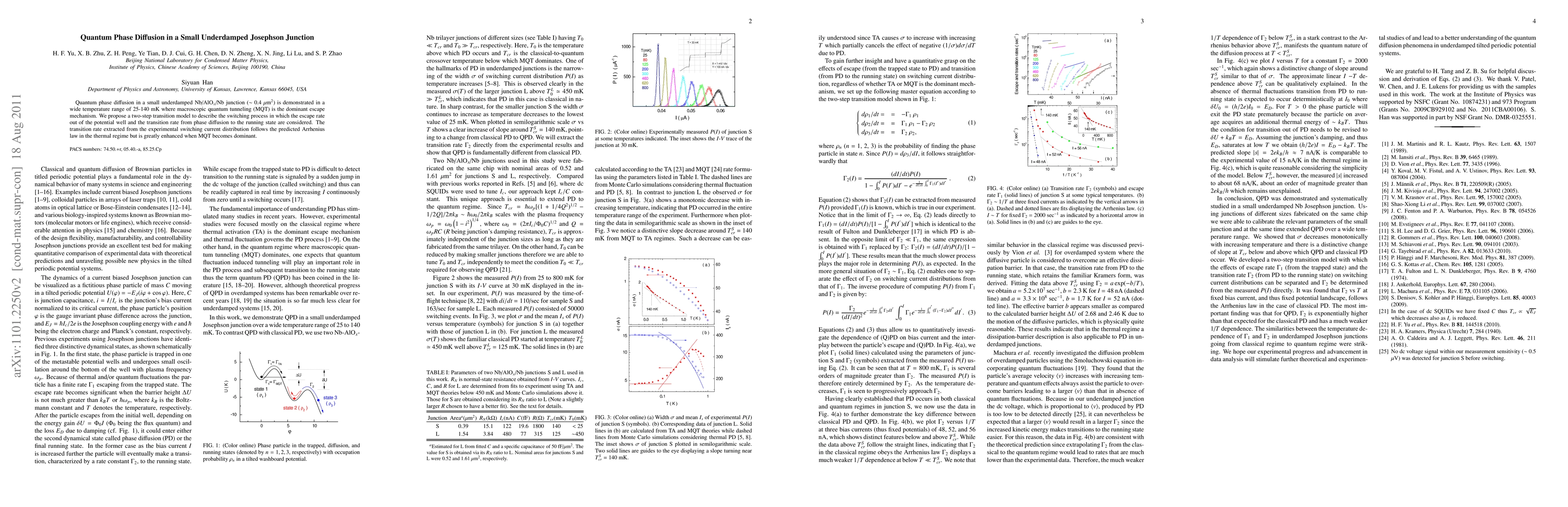 This paper demonstrates quantum phase diffusion in a small underdamped Josephson junction, showing that macroscopic quantum tunneling dominates at low temperatures. A two-step transition model is proposed to explain the switching process, with the transition rate following the Arrhenius law in thermal conditions but significantly enhanced by MQT.