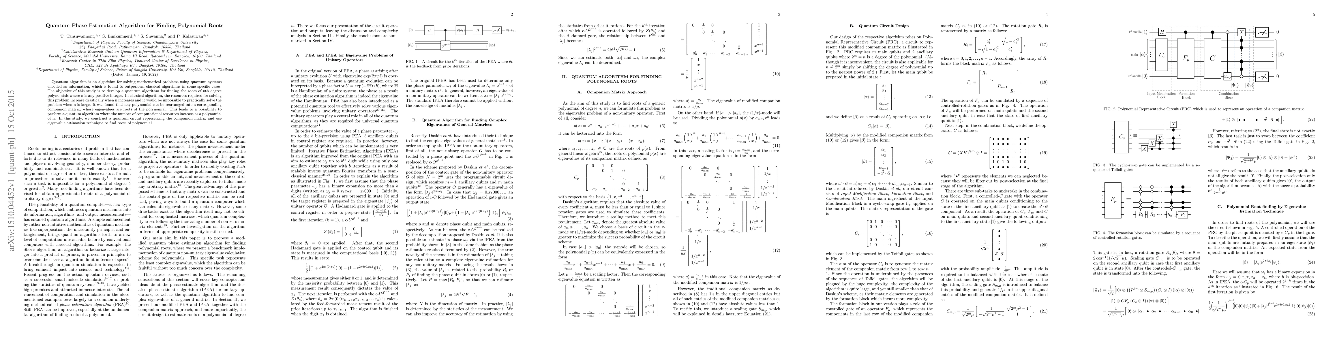 Quantum algorithm is an algorithm for solving mathematical problems using quantum systems encoded as information, which is found to outperform classical algorithms in some specific cases. The objective of this study is to develop a quantum algorithm for finding the roots of nth degree polynomials where n is any positive integer. In classical algorithm, the resources required for solving this problem increase drastically when n increases and it would be impossible to practically solve the problem when n is large. It was found that any polynomial can be rearranged into a corresponding companion matrix, whose eigenvalues are roots of the polynomial. This leads to a possibility to perform a quantum algorithm where the number of computational resources increase as a polynomial of n. In this study, we construct a quantum circuit representing the companion matrix and use eigenvalue estimation technique to find roots of polynomial.