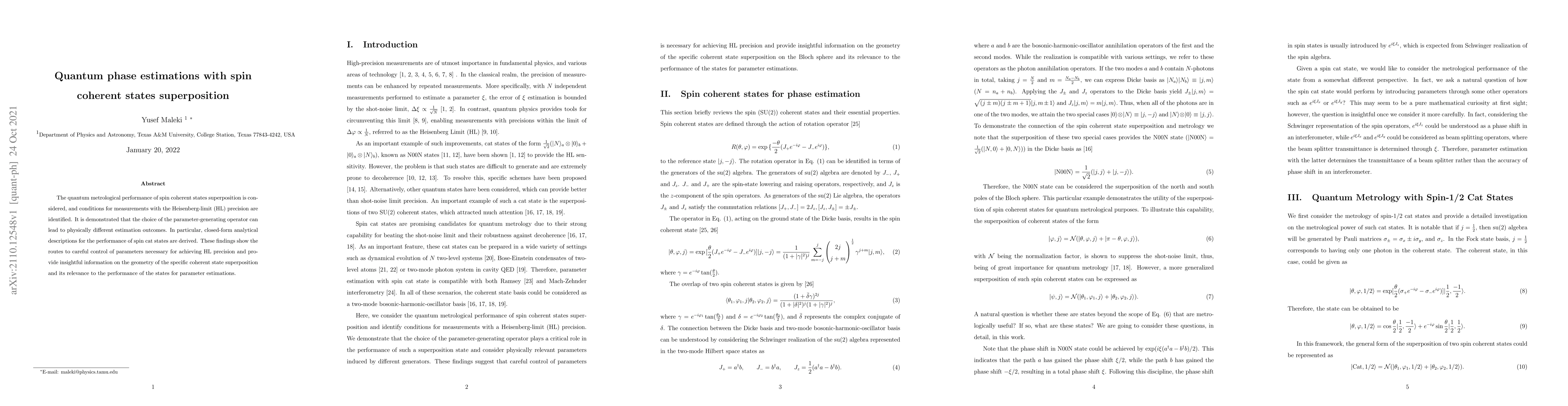 This paper investigates the quantum metrological performance of spin coherent states superposition, identifying conditions for Heisenberg-limit precision measurements. It reveals that the choice of the parameter-generating operator affects estimation outcomes, providing analytical descriptions for spin cat states and insights into the geometry of the superposition relevant to parameter estimations.