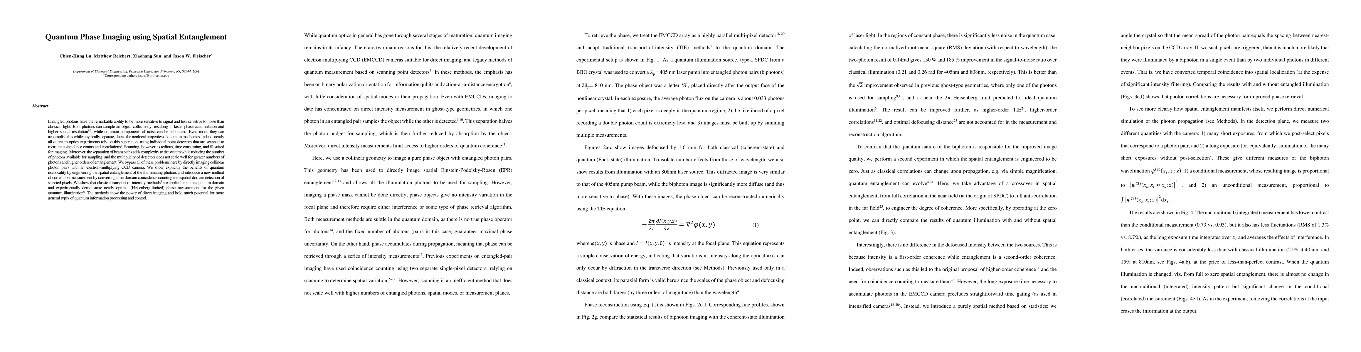 Entangled photons have the remarkable ability to be more sensitive to signal and less sensitive to noise than classical light. Joint photons can sample an object collectively, resulting in faster phase accumulation and higher spatial resolution, while common components of noise can be subtracted. Even more, they can accomplish this while physically separate, due to the nonlocal properties of quantum mechanics. Indeed, nearly all quantum optics experiments rely on this separation, using individual point detectors that are scanned to measure coincidence counts and correlations. Scanning, however, is tedious, time consuming, and ill-suited for imaging. Moreover, the separation of beam paths adds complexity to the system while reducing the number of photons available for sampling, and the multiplicity of detectors does not scale well for greater numbers of photons and higher orders of entanglement. We bypass all of these problems here by directly imaging collinear photon pairs with an electron-multiplying CCD camera. We show explicitly the benefits of quantum nonlocality by engineering the spatial entanglement of the illuminating photons and introduce a new method of correlation measurement by converting time-domain coincidence counting into spatial-domain detection of selected pixels. We show that classical transport-of-intensity methods are applicable in the quantum domain and experimentally demonstrate nearly optimal (Heisenberg-limited) phase measurement for the given quantum illumination. The methods show the power of direct imaging and hold much potential for more general types of quantum information processing and control.