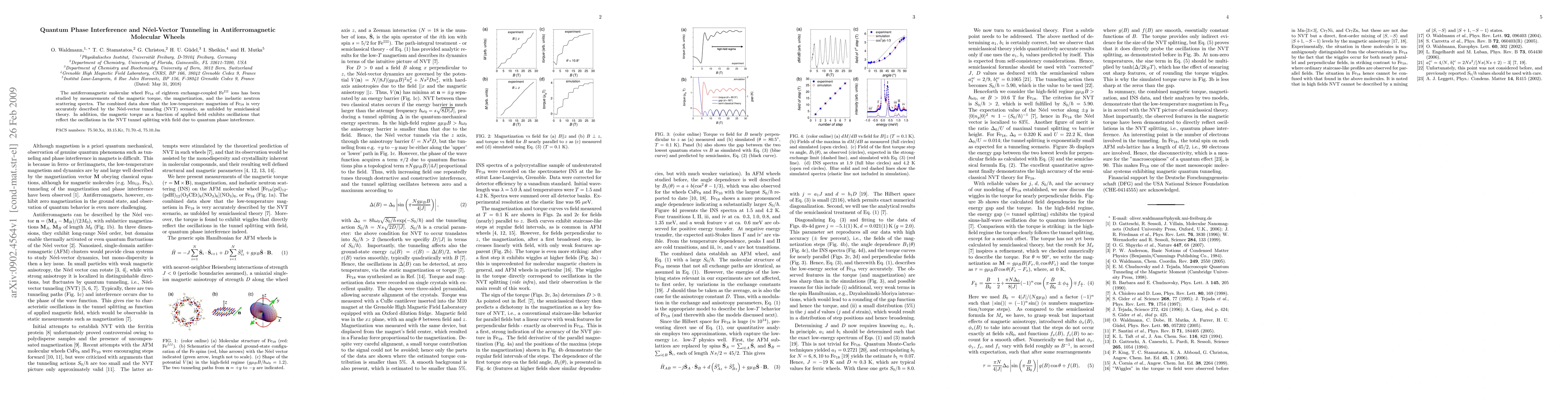 Researchers studied Fe18 molecular wheel and found its low-temperature magnetism follows Neel-vector tunneling theory with oscillations in magnetic torque that reflect quantum phase interference.