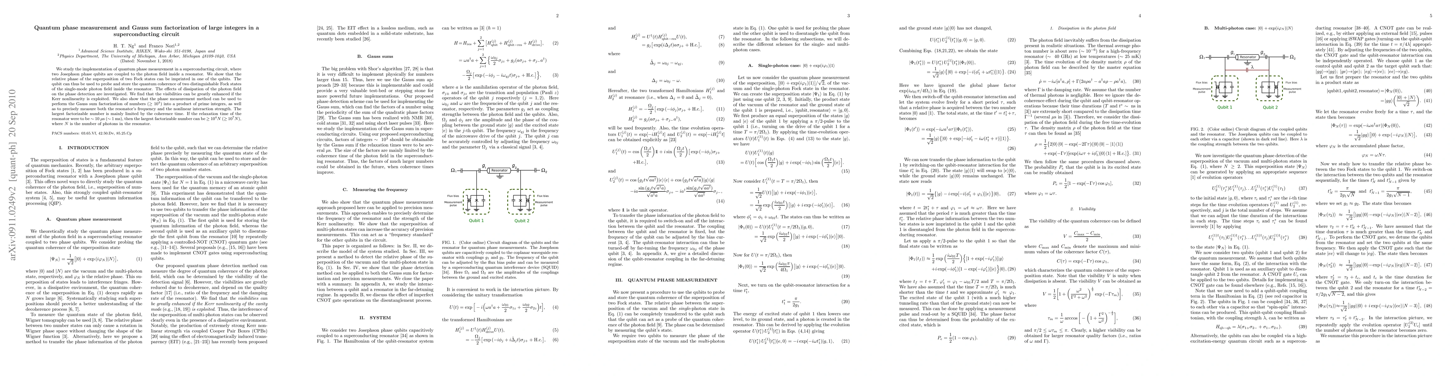 This research demonstrates a method using superconducting circuits to measure quantum phase and factorize large integers via Gauss sum. The technique involves two Josephson phase qubits coupled to a photon field in a resonator, with Kerr nonlinearity enhancing phase detection visibilities. The approach can factorize numbers up to $10^4$ and measure resonator frequency precisely, with potential to extend to much larger numbers given improved coherence times.