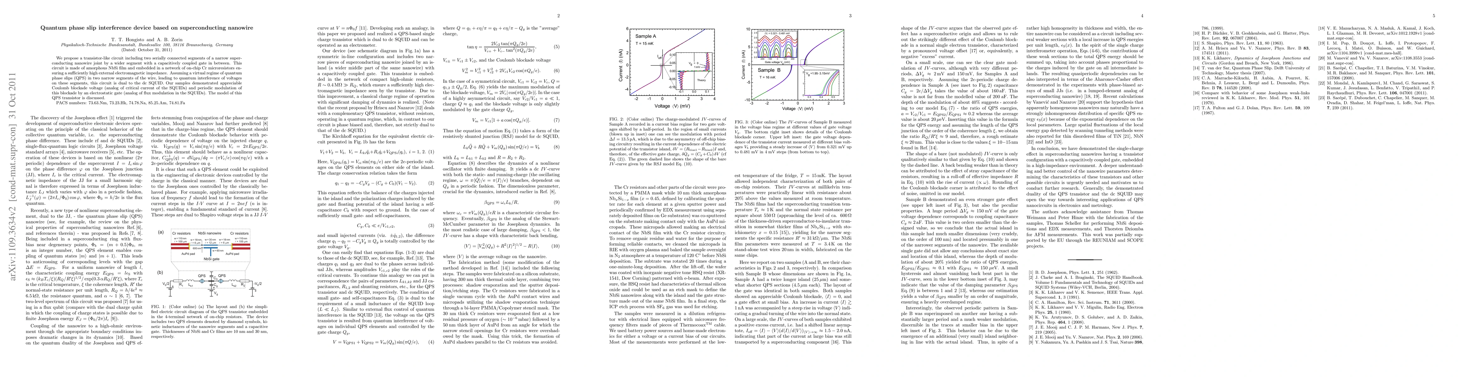 We propose a transistor-like circuit including two serially connected segments of a narrow superconducting nanowire joint by a wider segment with a capacitively coupled gate in between. This circuit is made of amorphous NbSi film and embedded in a network of on-chip Cr microresistors ensuring a sufficiently high external electromagnetic impedance. Assuming a virtual regime of quantum phase slips (QPS)in two narrow segments of the wire, leading to quantum interference of voltages on these segments, this circuit is dual to the dc SQUID. Our samples demonstrated appreciable Coulomb blockade voltage (analog of critical current of the SQUIDs) and periodic modulation of this blockade by an electrostatic gate (analog of flux modulation in the SQUIDs). The model of this QPS transistor is discussed.