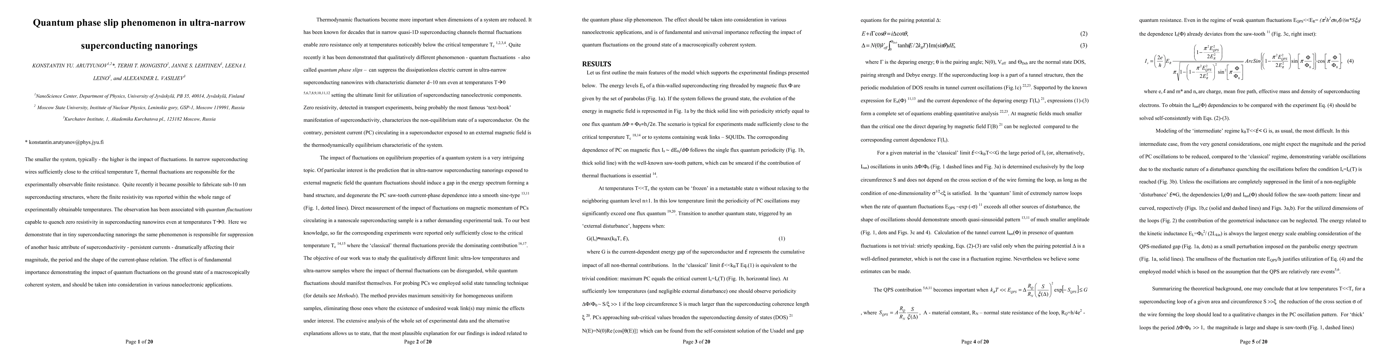 This paper investigates the quantum phase slip phenomenon in ultra-narrow superconducting nanorings, revealing that quantum fluctuations can suppress persistent currents and alter the current-phase relation. This effect highlights the fundamental impact of quantum fluctuations on macroscopically coherent systems and has implications for nanoelectronic applications.