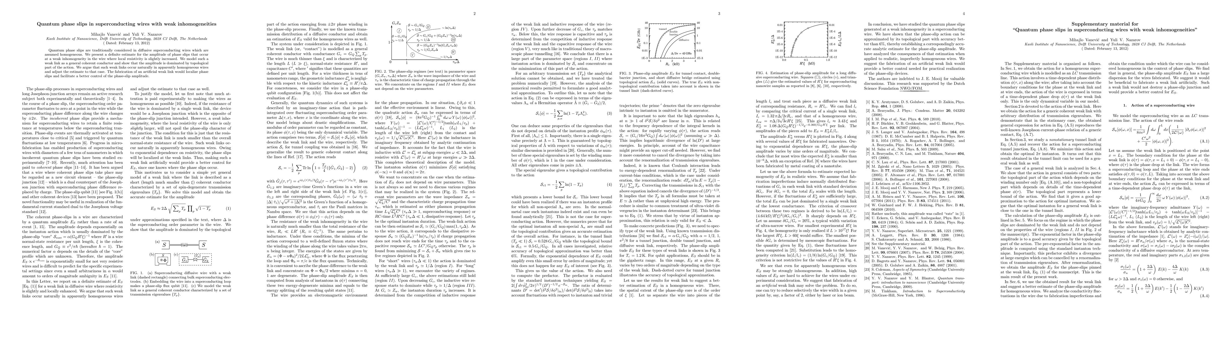 This paper estimates the amplitude of quantum phase slips in superconducting wires with weak inhomogeneities, demonstrating that these slips are mainly influenced by the topological part of the action. It suggests that weak links naturally occur in seemingly homogeneous wires and proposes that fabricating artificial weak links could localize and better control phase-slip amplitudes.