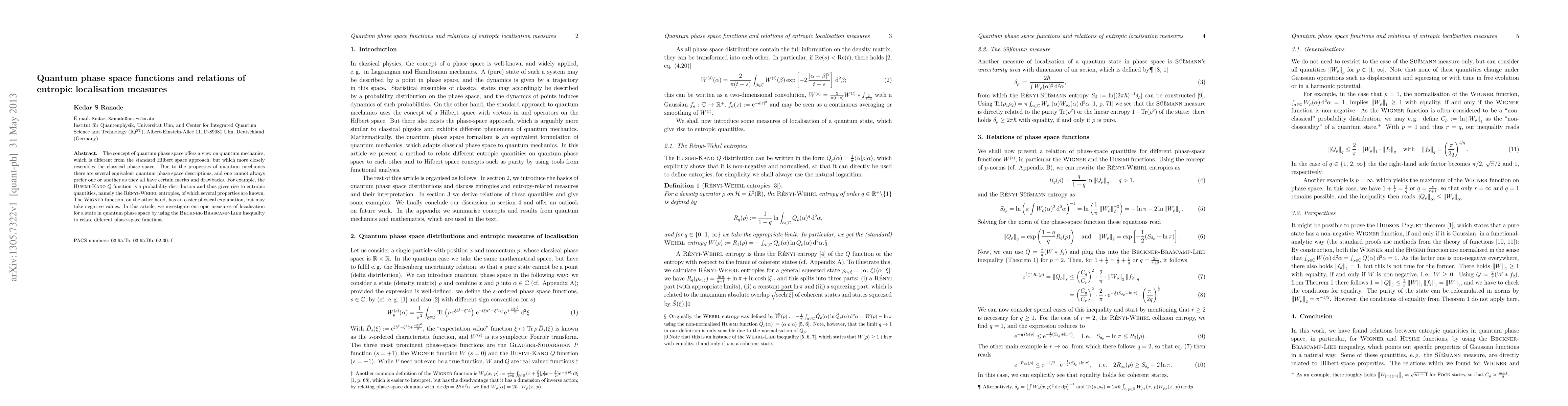 This paper explores entropic measures of localisation in quantum phase space, comparing the Husimi-Kano Q function and the Wigner function. The Beckner-Brascamp-Lieb inequality is used to relate these functions and their associated entropic quantities.