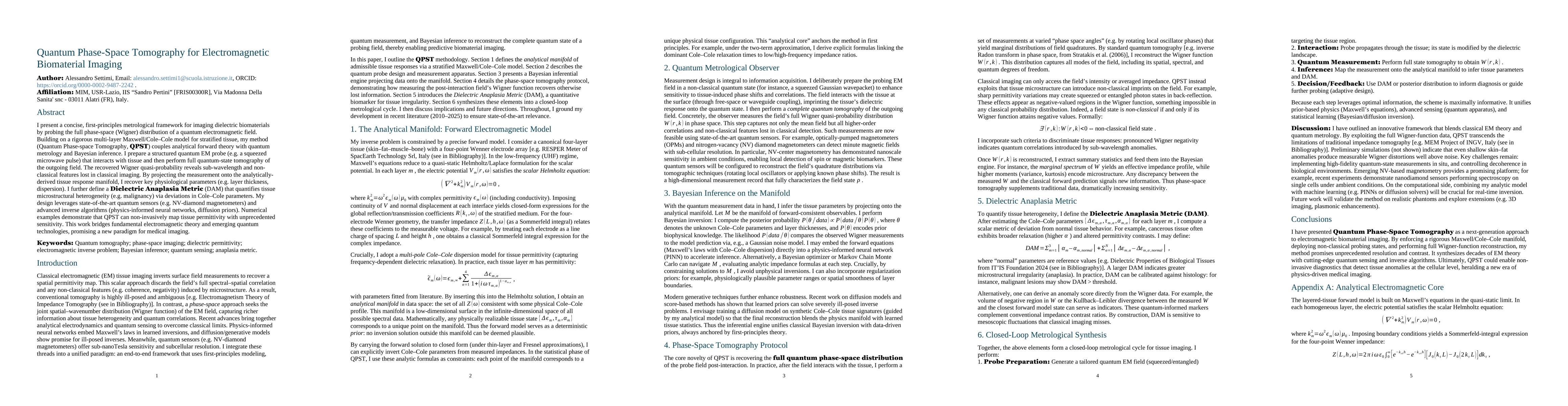 I present a concise, first principles metrological framework for imaging dielectric biomaterials by probing the full phase space (Wigner) distribution of a quantum electromagnetic field. Building on a rigorous multilayer Maxwell and Cole Cole model for stratified tissue, my method (Quantum Phase space Tomography, QPST) couples analytical forward theory with quantum metrology and Bayesian inference. I prepare a structured quantum EM probe (e.g. a squeezed microwave pulse) that interacts with tissue and then perform full quantum state tomography of the outgoing field. The recovered Wigner quasi probability reveals subwavelength and non classical features lost in classical imaging. By projecting the measurement onto the analytically derived tissue response manifold, I recover key physiological parameters (e.g. layer thickness, dispersion). I further define a Dielectric Anaplasia Metric (DAM) that quantifies tissue microstructural heterogeneity (e.g. malignancy) via deviations in Cole Cole parameters. My design leverages state of the art quantum sensors (e.g. NV diamond magnetometers) and advanced inverse algorithms (physics informed neural networks, diffusion priors). Numerical examples demonstrate that QPST can non invasively map tissue permittivity with unprecedented sensitivity. This work bridges fundamental electromagnetic theory and emerging quantum technologies, promising a new paradigm for medical imaging.