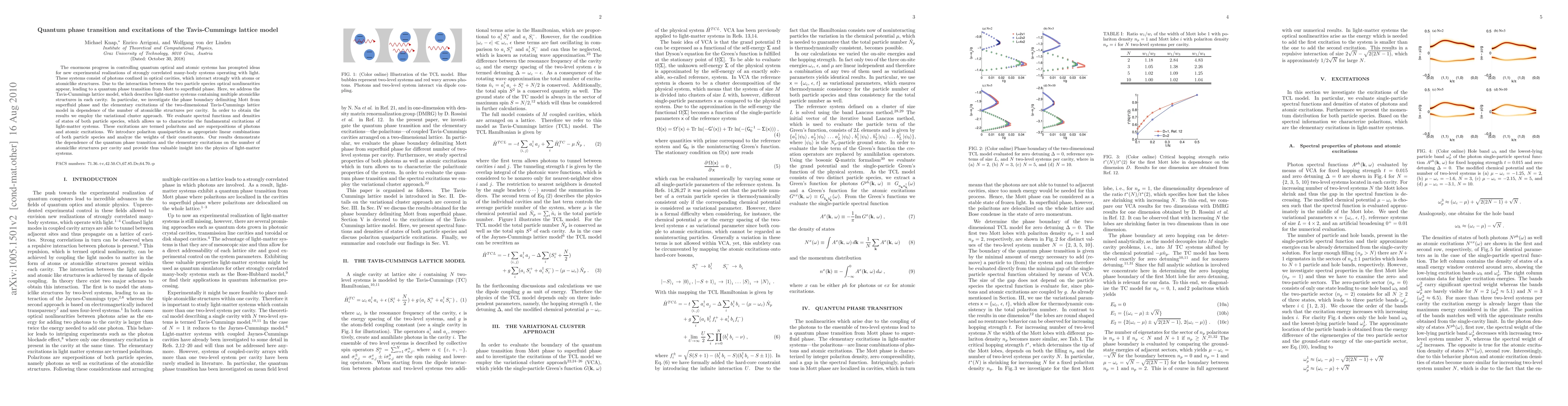 The enormous progress in controlling quantum optical and atomic systems has prompted ideas for new experimental realizations of strongly correlated many-body systems operating with light. These systems consist of photons confined in optical cavities, which interact strongly with atoms or atomiclike structures. Due to the interaction between the two particle species optical nonlinearities appear, leading to a quantum phase transition from Mott to superfluid phase. Here, we address the Tavis-Cummings lattice model, which describes light-matter systems containing multiple atomiclike structures in each cavity. In particular, we investigate the phase boundary delimiting Mott from superfluid phase and the elementary excitations of the two-dimensional Tavis-Cummings lattice model in dependence of the number of atomiclike structures per cavity. In order to obtain the results we employ the variational cluster approach. We evaluate spectral functions and densities of states of both particle species, which allows us to characterize the fundamental excitations of light-matter systems. These excitations are termed polaritons and are superpositions of photons and atomic excitations. We introduce polariton quasiparticles as appropriate linear combinations of both particle species and analyze the weights of their constituents. Our results demonstrate the dependence of the quantum phase transition and the elementary excitations on the number of atomiclike structures per cavity and provide thus valuable insight into the physics of light-matter systems.