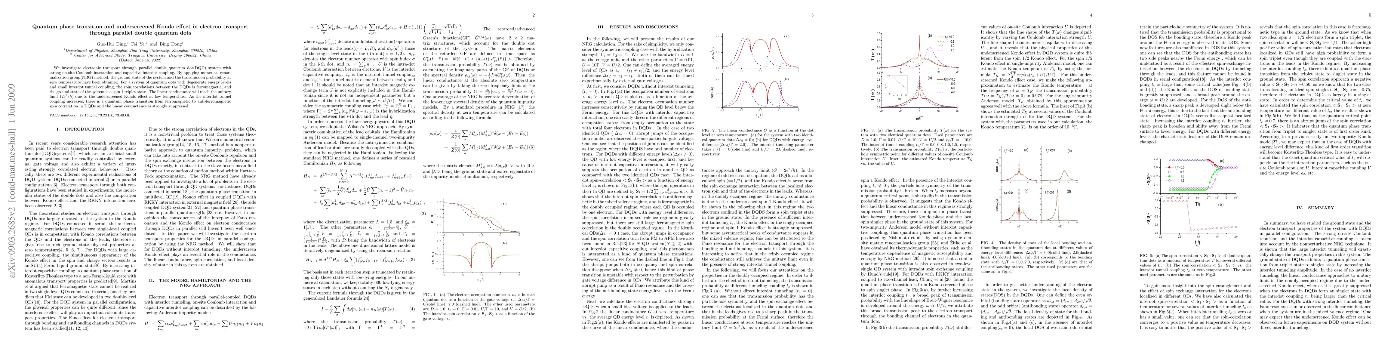 This paper examines electronic transport in parallel double quantum dot systems with strong Coulomb interactions and capacitive coupling, revealing a quantum phase transition and an underscreened Kondo effect. The study finds that at low temperatures, the system exhibits unitary conductance due to the underscreened Kondo effect, but as interdot coupling increases, the spin correlations change from ferromagnetic to antiferromagnetic, significantly reducing linear conductance.
