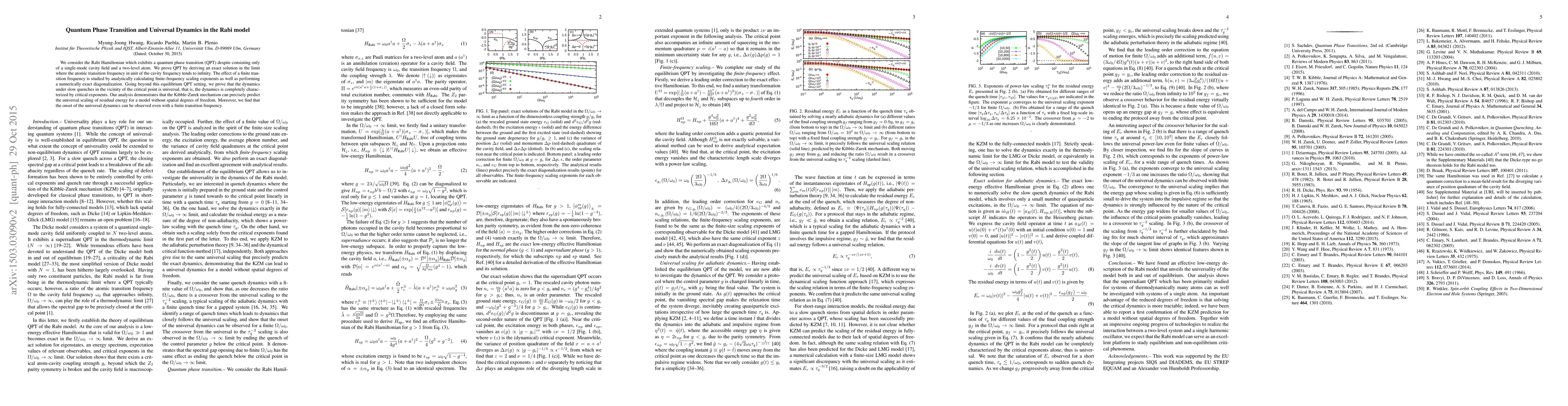 This paper investigates the quantum phase transition (QPT) in the Rabi model, demonstrating its occurrence through an exact solution and finite-frequency analysis. It also reveals universal dynamics under slow quenches near the critical point, showing that the Kibble-Zurek mechanism predicts the scaling of residual energy, even with a finite transition frequency.