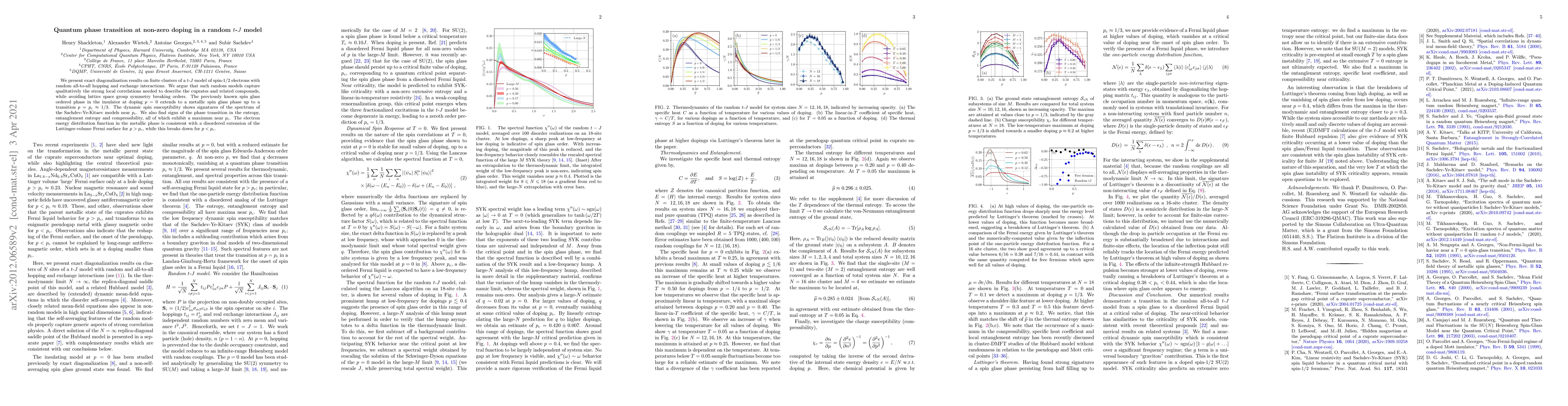 This research uses exact diagonalization on finite clusters to study a random t-J model, showing a quantum phase transition to a metallic spin glass phase at approximately p=1/3. Key indicators like dynamic spin susceptibility, entropy, entanglement entropy, and compressibility exhibit anomalies near this critical doping level, p_c. The electron energy distribution function suggests a Fermi surface for p>p_c, unlike for p<p_c, highlighting the model's relevance to understanding cuprate behavior.