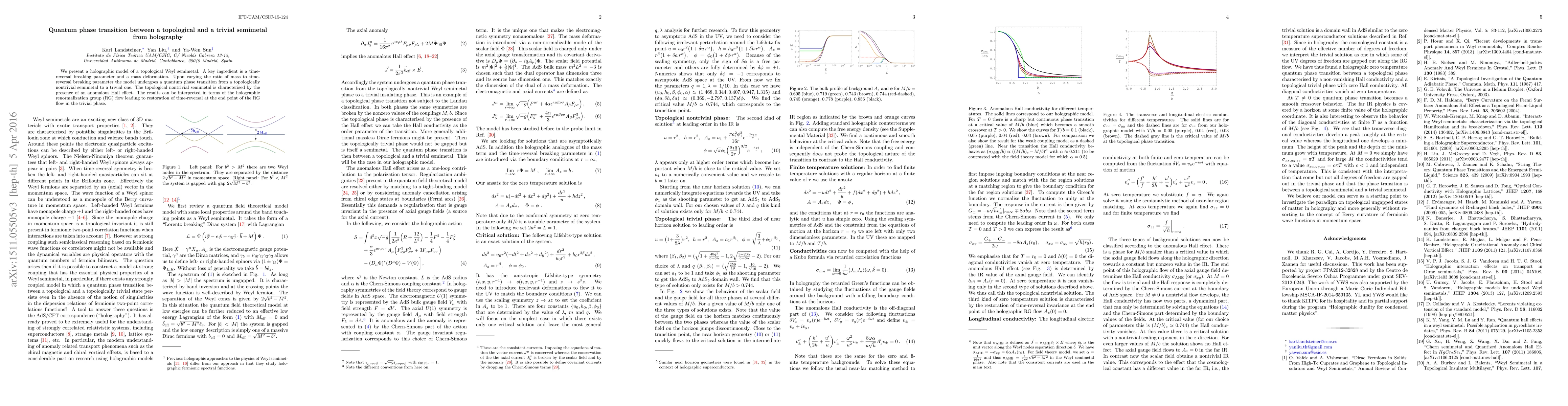 This paper presents a holographic model of a topological Weyl semimetal, demonstrating a quantum phase transition driven by varying the ratio of mass to time-reversal breaking parameter, leading to a transition from a topologically nontrivial semimetal with an anomalous Hall effect to a trivial phase. The transition is interpreted via holographic renormalization group flow, showing the restoration of time-reversal symmetry in the trivial phase.