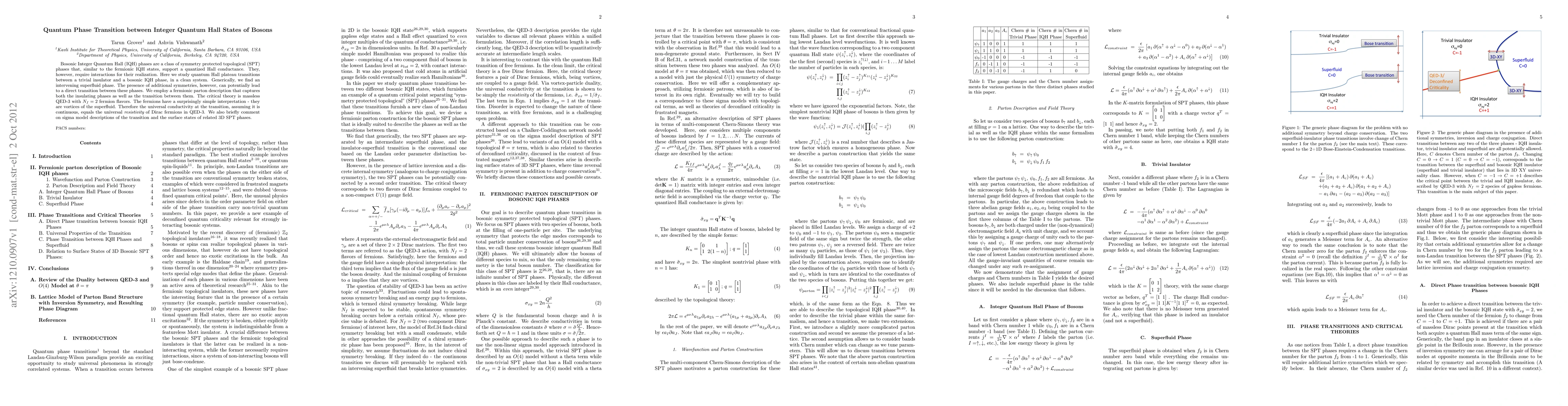 This paper investigates quantum phase transitions between trivial insulator and bosonic Integer Quantum Hall phases, identifying an intervening superfluid phase in clean systems. Under additional symmetries, direct transitions are possible, and the critical theory is described by massless QED-3 with two fermion flavors representing superfluid vortices.