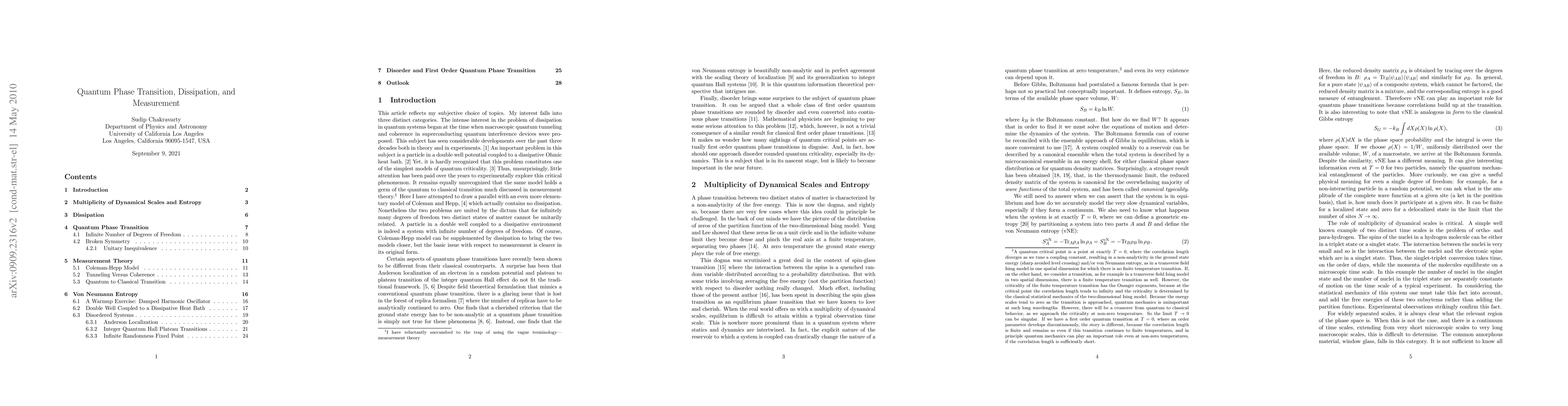 This paper explores the connections between quantum phase transitions, dissipation, disorder, and measurement theory in quantum mechanics, shedding light on the behavior of systems at critical points.