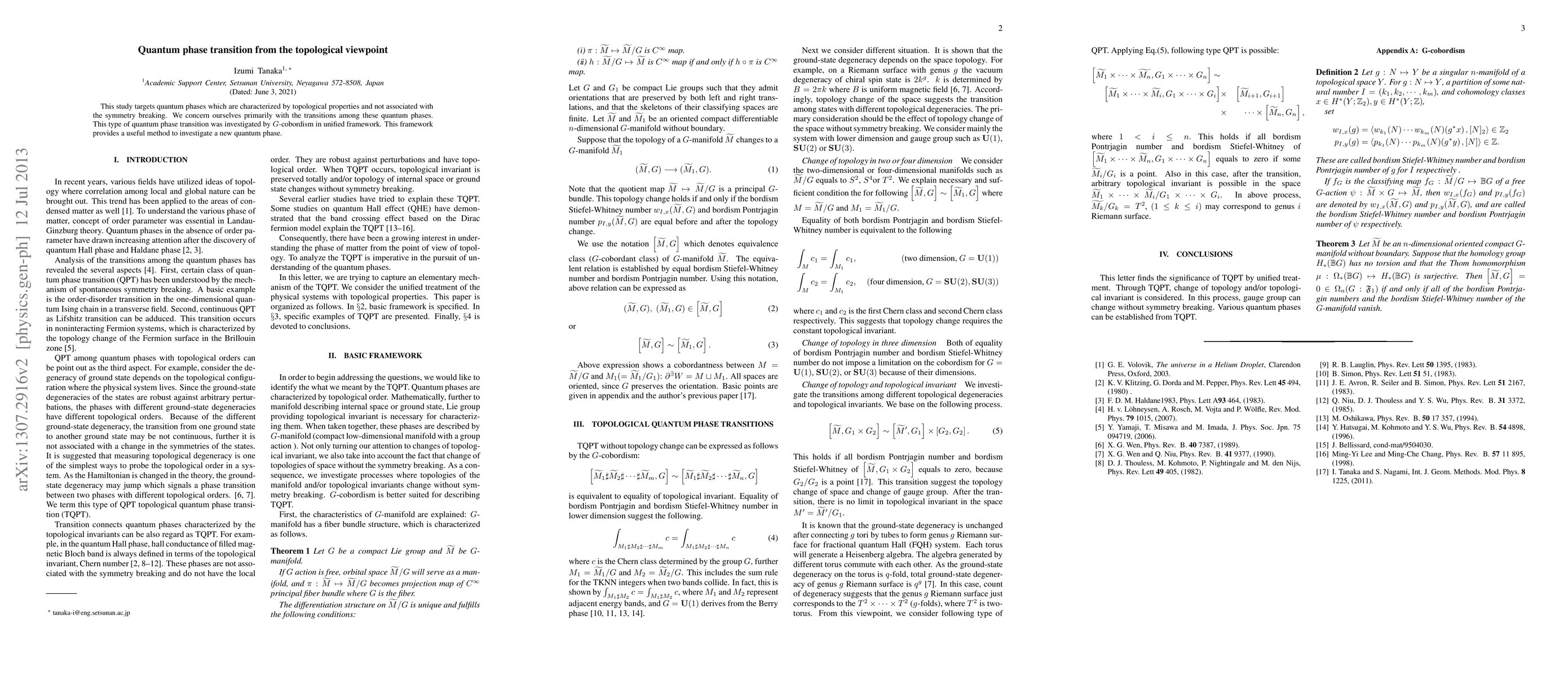 This study targets quantum phases which are characterized by topological properties and no associated with the symmetry breaking. We concern ourselves primarily with the transitions among these quantum phases. This type of quantum phase transition was investigated by $G$-cobordism in unified framework. This framework provides a useful method to investigate a new quantum phase.