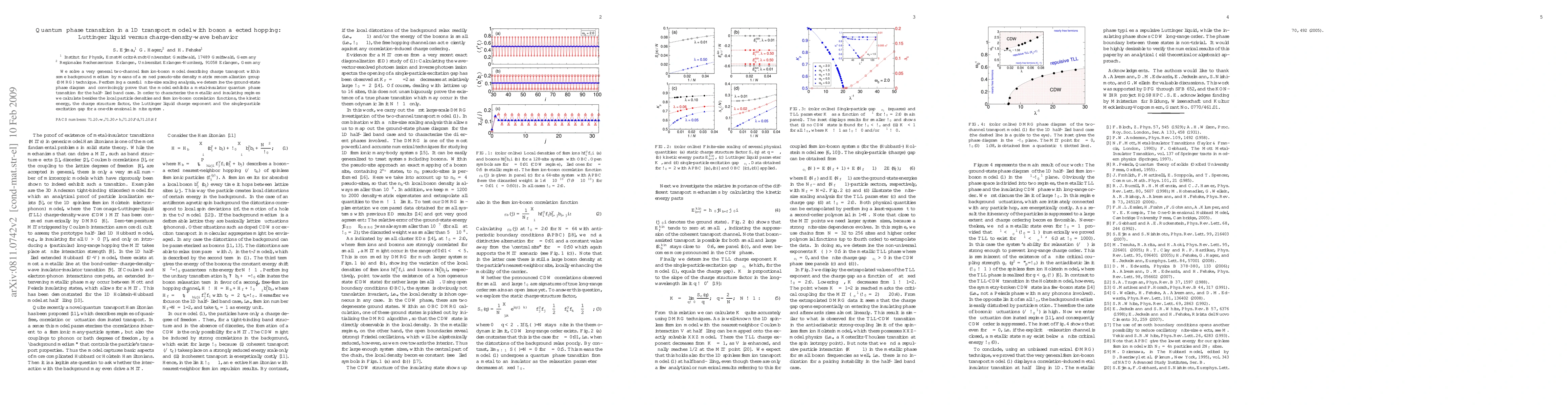 This paper investigates a two-channel fermion-boson model using advanced DMRG techniques to explore charge transport and quantum phase transitions. It reveals a metal-insulator transition in the half-filled band scenario, characterized by Luttinger liquid behavior in the metallic phase and charge-density-wave features in the insulating phase.