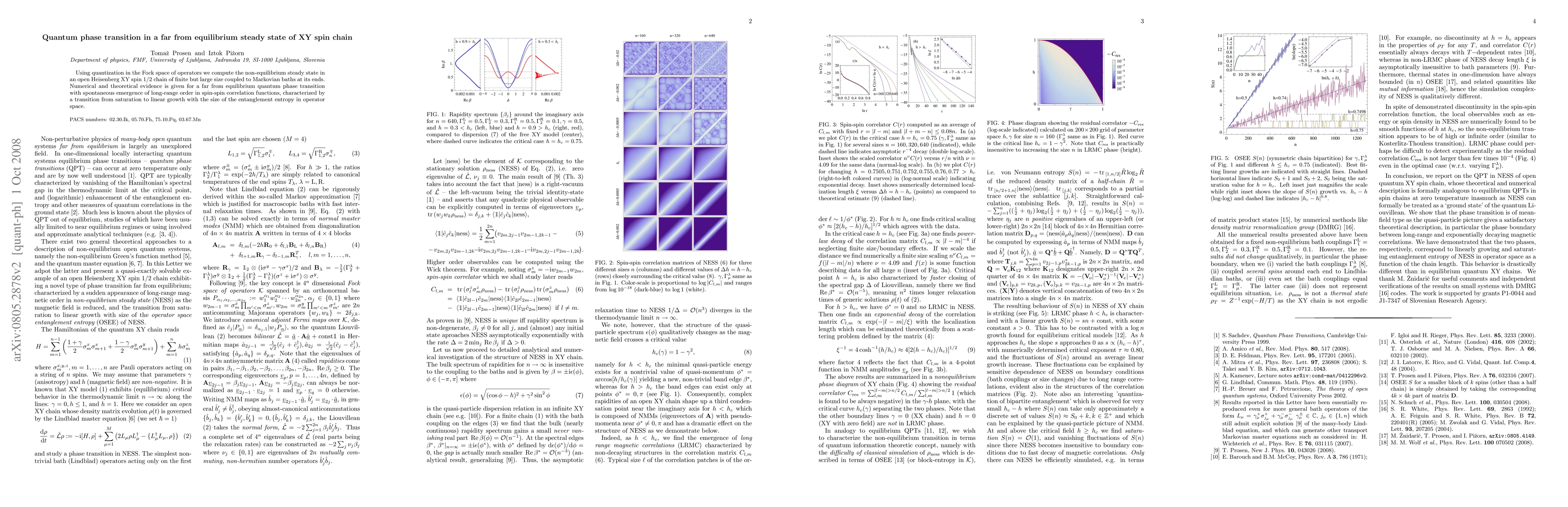 Using quantization in the Fock space of operators we compute the non-equilibrium steady state in an open Heisenberg XY spin 1/2 chain of finite but large size coupled to Markovian baths at its ends. Numerical and theoretical evidence is given for a far from equilibrium quantum phase transition with spontaneous emergence of long-range order in spin-spin correlation functions, characterized by a transition from saturation to linear growth with the size of the entanglement entropy in operator space.