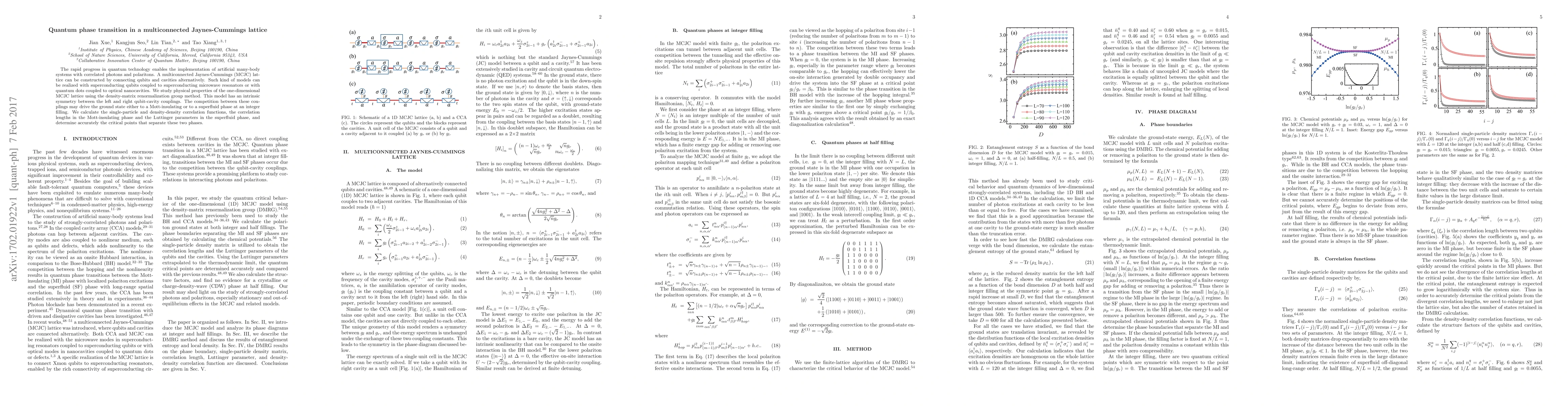 This paper investigates a one-dimensional multiconnected Jaynes-Cummings lattice, modeling correlated photons and polaritons in superconducting or quantum systems. Using density-matrix renormalization, it explores the quantum phase transition between Mott-insulating and superfluid phases driven by competition between left and right qubit-cavity couplings.