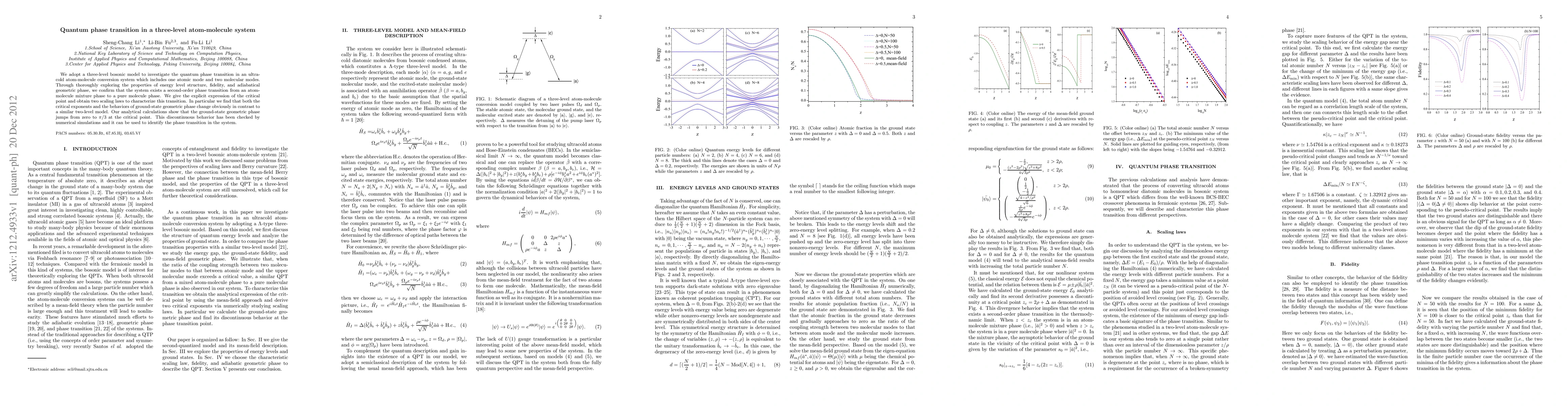 The research employs a three-level bosonic model to investigate quantum phase transition in an ultracold atom-molecule conversion system, exploring energy level structure, fidelity, and adiabatic geometric phase.