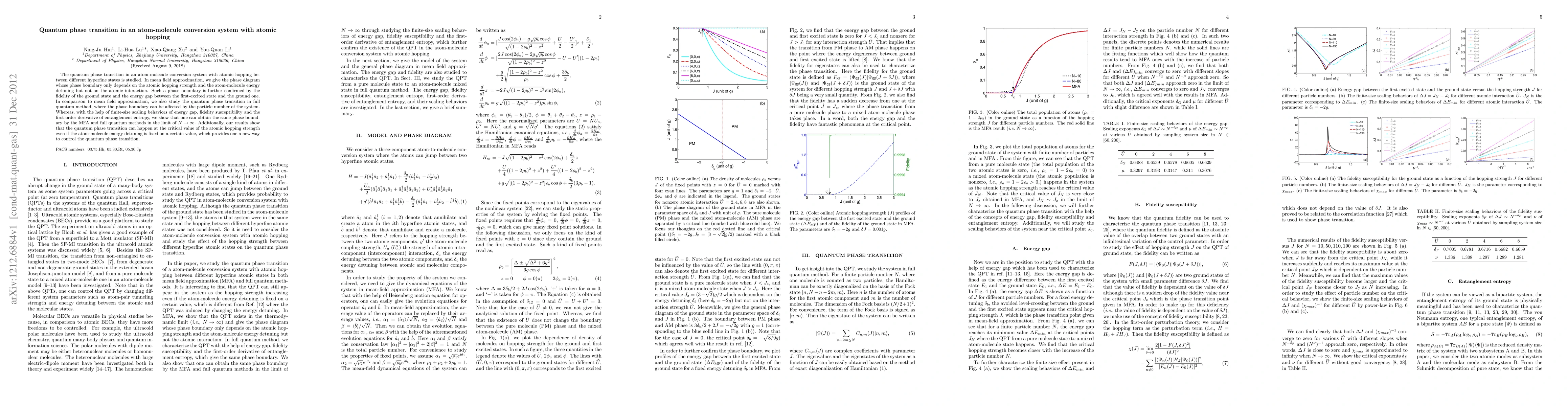 This paper investigates the quantum phase transition in an atom-molecule conversion system with atomic hopping, revealing a phase boundary dependent on hopping strength and energy detuning. It confirms the transition using ground state fidelity and energy gap, and shows that mean field and full quantum methods converge for large systems.