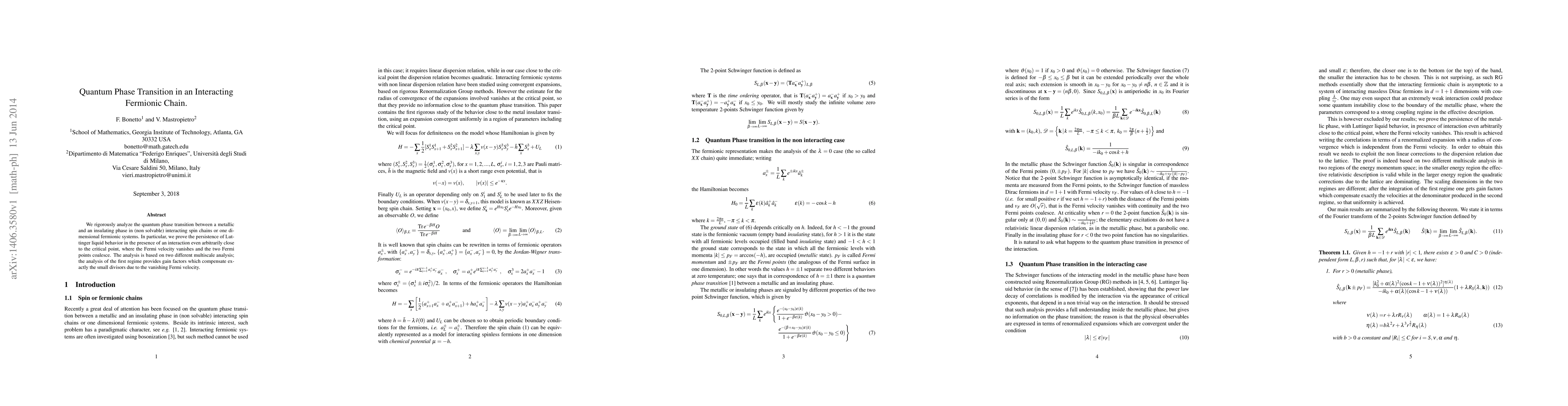 This paper rigorously analyzes the quantum phase transition in interacting fermionic chains, proving the persistence of Luttinger liquid behavior near the critical point where the Fermi velocity vanishes. The study employs two multiscale analyses to compensate for small divisors and gain factors.
