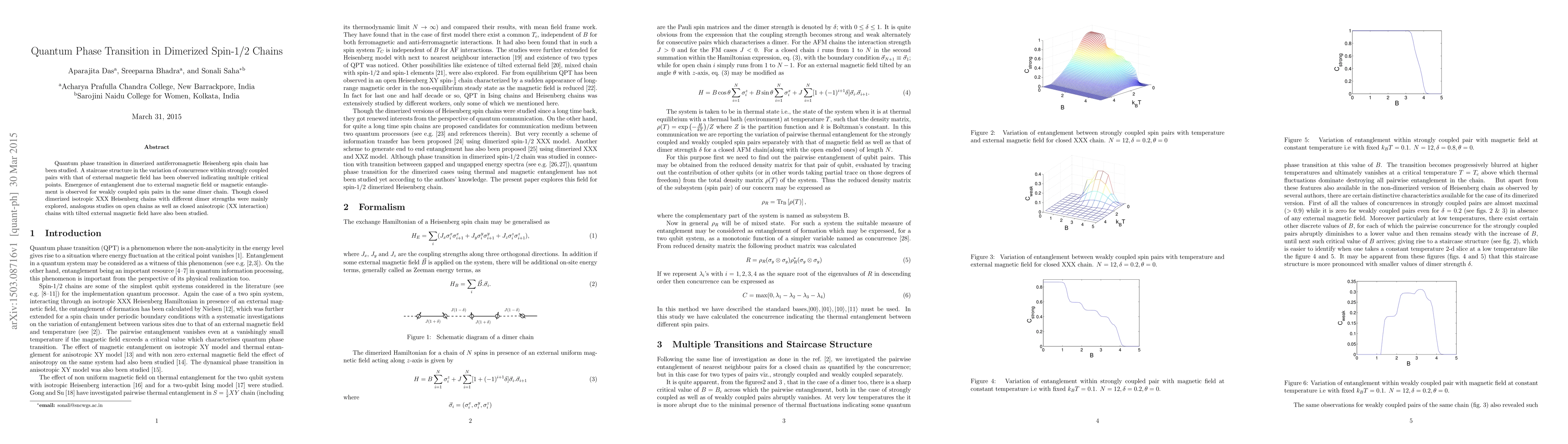 This paper investigates quantum phase transitions in dimerized spin-1/2 chains, revealing a staircase structure in concurrence variation with magnetic fields indicating multiple critical points. It also observes entanglement emergence in weakly coupled pairs due to external magnetic fields, with studies extending to both open and anisotropic chains.