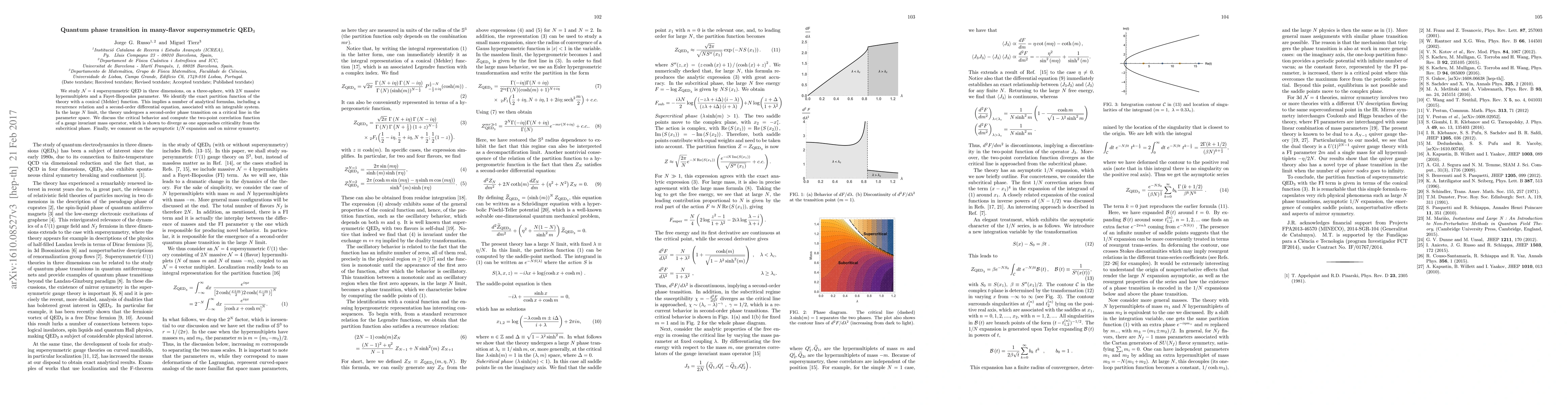 We study $\mathcal{N}=4$ supersymmetric QED in three dimensions, on a three-sphere, with 2N massive hypermultiplets and a Fayet-Iliopoulos parameter. We identify the exact partition function of the theory with a conical (Mehler) function. This implies a number of analytical formulas, including a recurrence relation and a second-order differential equation, associated with an integrable system. In the large N limit, the theory undergoes a second-order phase transition on a critical line in the parameter space. We discuss the critical behavior and compute the two-point correlation function of a gauge invariant mass operator, which is shown to diverge as one approaches criticality from the subcritical phase. Finally, we comment on the asymptotic 1/N expansion and on mirror symmetry.