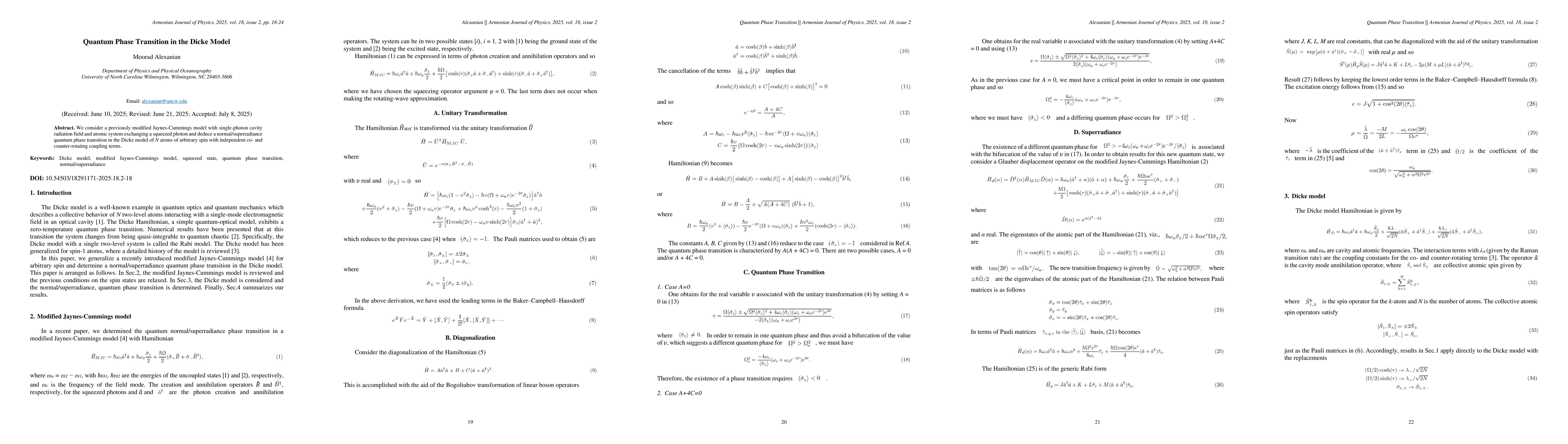 We consider a previously modified Jaynes-Cummings model with single-photon cavity radiation field and atomic system exchanging a squeezed photon and deduce a normal/superradiance quantum phase transition in the Dicke model of N atoms of arbitrary spin with independent co- and counter-rotating coupling terms.