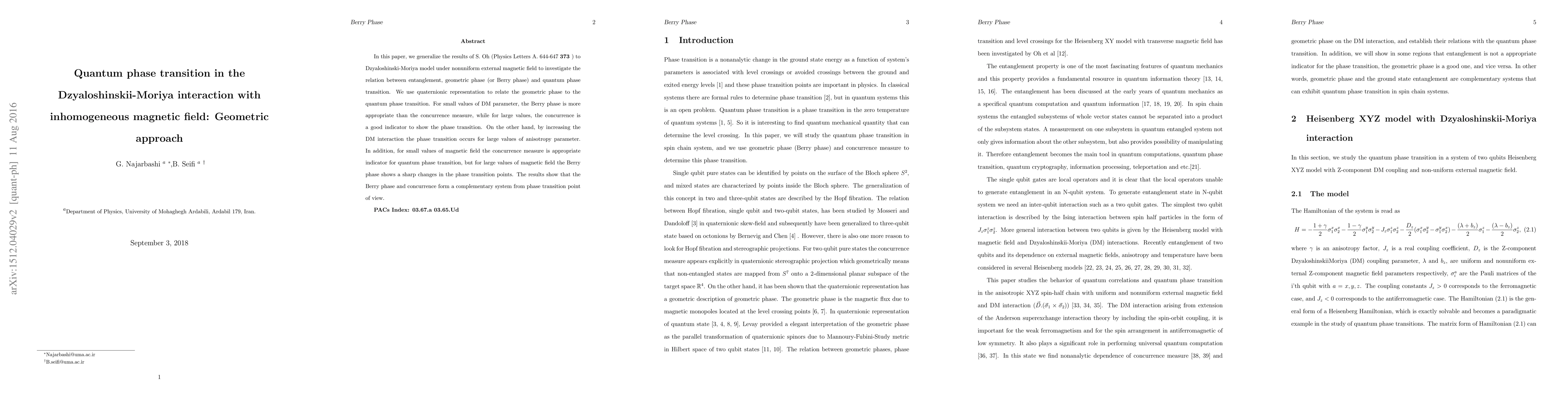 In this paper, we generalize the results of S. Oh (Physics Letters A. 644-647 \textbf{373 }) to Dzyaloshinski-Moriya model under nonuniform external magnetic field to investigate the relation between entanglement, geometric phase (or Berry phase) and quantum phase transition. We use quaternionic representation to relate the geometric phase to the quantum phase transition. For small values of DM parameter, the Berry phase is more appropriate than the concurrence measure, while for large values, the concurrence is a good indicator to show the phase transition. On the other hand, by increasing the DM interaction the phase transition occurs for large values of anisotropy parameter. In addition, for small values of magnetic field the concurrence measure is appropriate indicator for quantum phase transition, but for large values of magnetic field the Berry phase shows a sharp changes in the phase transition points. The results show that the Berry phase and concurrence form a complementary system from phase transition point of view.
