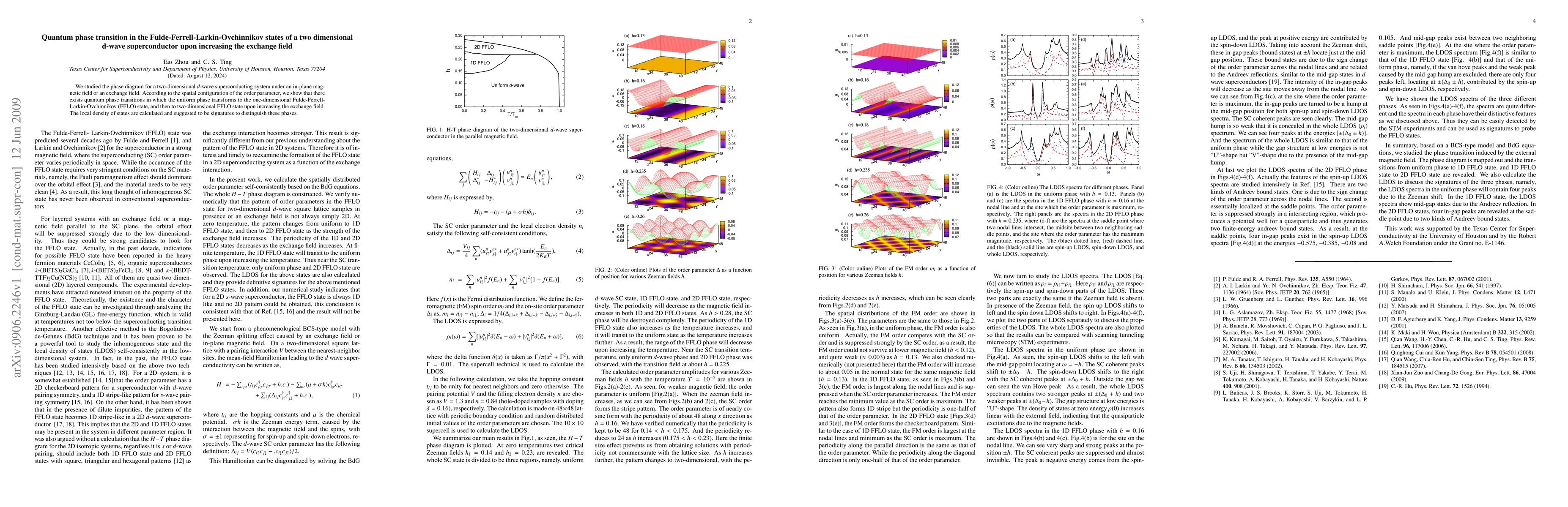 This paper investigates the quantum phase transitions in a two-dimensional d-wave superconductor under an increasing exchange field, revealing transitions from a uniform phase to one-dimensional and then to two-dimensional Fulde-Ferrell-Larkin-Ovchinnikov (FFLO) states. The study suggests local density of states as a distinguishing signature for these phases.