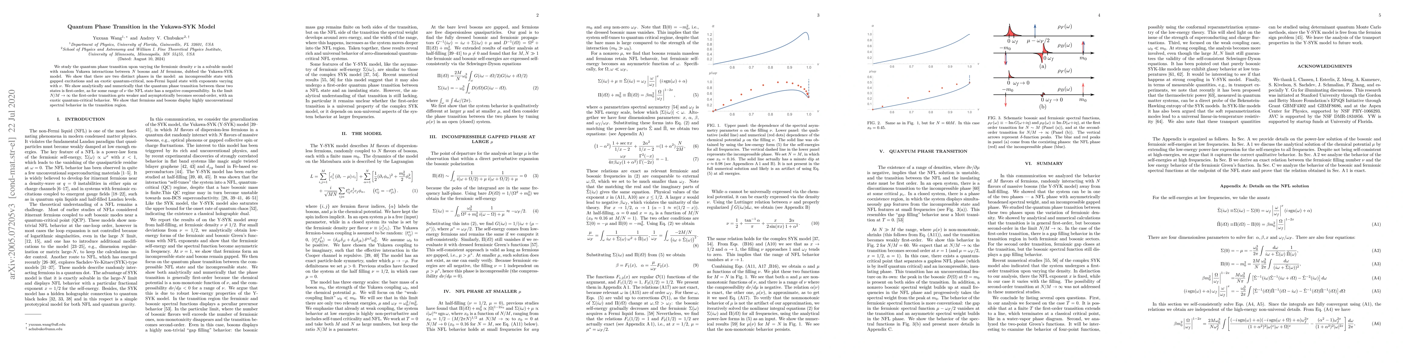 This paper investigates the quantum phase transition in the Yukawa-SYK model, revealing two distinct phases: an incompressible state with gapped excitations and an exotic quantum-critical non-Fermi liquid state. The transition is first-order, becoming second-order in the large $N/M$ limit, with unconventional spectral behavior for fermions and bosons near the critical point.