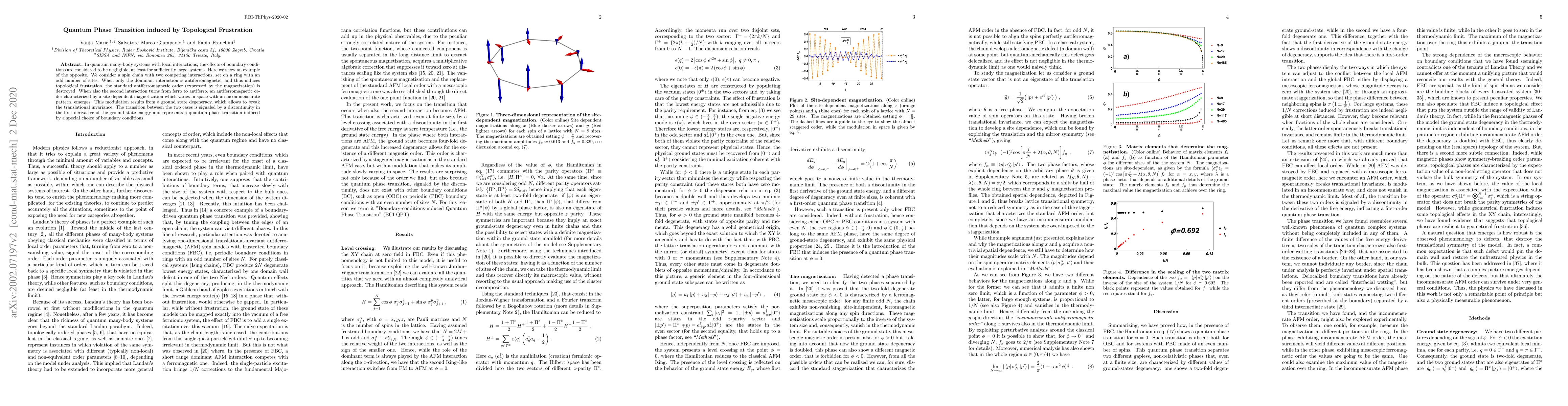 In quantum many-body systems with local interactions, the effects of boundary conditions are considered to be negligible, at least for sufficiently large systems. Here we show an example of the opposite. We consider a spin chain with two competing interactions, set on a ring with an odd number of sites. When only the dominant interaction is antiferromagnetic, and thus induces topological frustration, the standard antiferromagnetic order (expressed by the magnetization) is destroyed. When also the second interaction turns from ferro to antiferro, an antiferromagnetic order characterized by a site-dependent magnetization which varies in space with an incommensurate pattern, emerges. This modulation results from a ground state degeneracy, which allows to break the translational invariance. The transition between the two cases is signaled by a discontinuity in the first derivative of the ground state energy and represents a quantum phase transition induced by a special choice of boundary conditions.