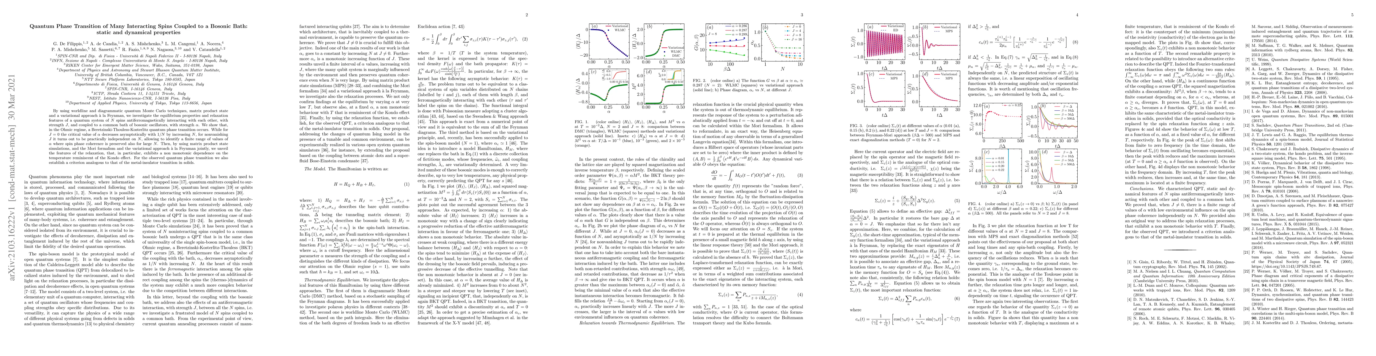 By using worldline and diagrammatic quantum Monte Carlo techniques, matrix product state and a variational approach \`a la Feynman, we investigate the equilibrium properties and relaxation features of a quantum system of $N$ spins antiferromagnetically interacting with each other, with strength $J$, and coupled to a common bath of bosonic oscillators, with strength $\alpha$. We show that, in the Ohmic regime, a Beretzinski-Thouless-Kosterlitz quantum phase transition occurs. While for $J=0$ the critical value of $\alpha$ decreases asymptotically with $1/N$ by increasing $N$, for nonvanishing $J$ it turns out to be practically independent on $N$, allowing to identify a finite range of values of $\alpha$ where spin phase coherence is preserved also for large $N$. Then, by using matrix product state simulations, and the Mori formalism and the variational approach \`a la Feynman jointly, we unveil the features of the relaxation, that, in particular, exhibits a non monotonic dependence on the temperature reminiscent of the Kondo effect. For the observed quantum phase transition we also establish a criterion analogous to that of the metal-insulator transition in solids.