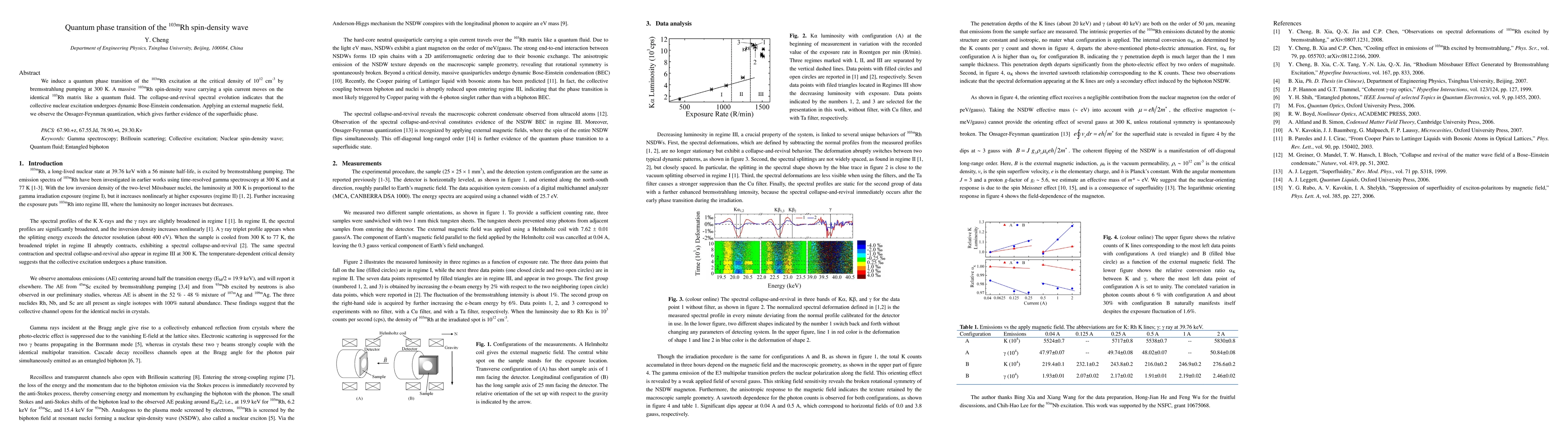 We induce a quantum phase transition of the 103mRh excitation at the critical density of 10^{12} cm^{-3} by bremsstrahlung pumping at 300 K. A massive 103mRh spin-density wave carrying a spin current moves on the identical 103Rh matrix like a quantum fluid. The collapse-and-revival spectral evolution indicates that the collective nuclear excitation undergoes dynamic Bose-Einstein condensation. Applying an external magnetic field, we observe the Onsager-Feynman quantization, which gives further evidence of the superfluidic phase.