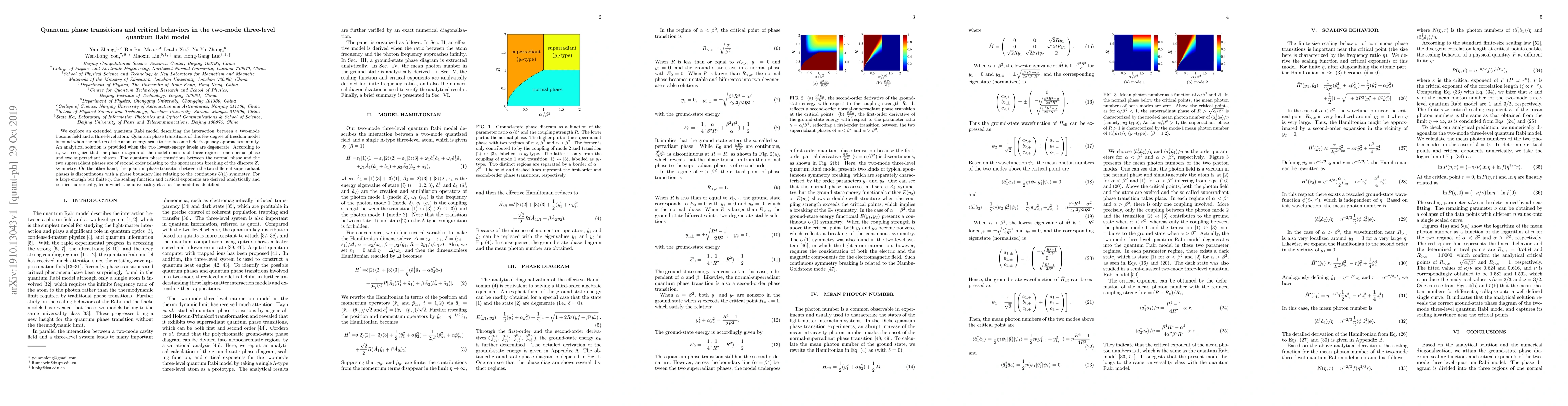 We explore an extended quantum Rabi model describing the interaction between a two-mode bosonic field and a three-level atom. Quantum phase transitions of this few degree of freedom model is found when the ratio $\eta$ of the atom energy scale to the bosonic field frequency approaches infinity. An analytical solution is provided when the two lowest-energy levels are degenerate. According to it, we recognize that the phase diagram of the model consists of three regions: one normal phase and two superradiant phases. The quantum phase transitions between the normal phase and the two superradiant phases are of second order relating to the spontaneous breaking of the discrete $Z_{2}$ symmetry. On the other hand, the quantum phase transition between the two different superradiant phases is discontinuous with a phase boundary line relating to the continuous $U(1)$ symmetry. For a large enough but finite $\eta$, the scaling function and critical exponents are derived analytically and verified numerically, from which the universality class of the model is identified.