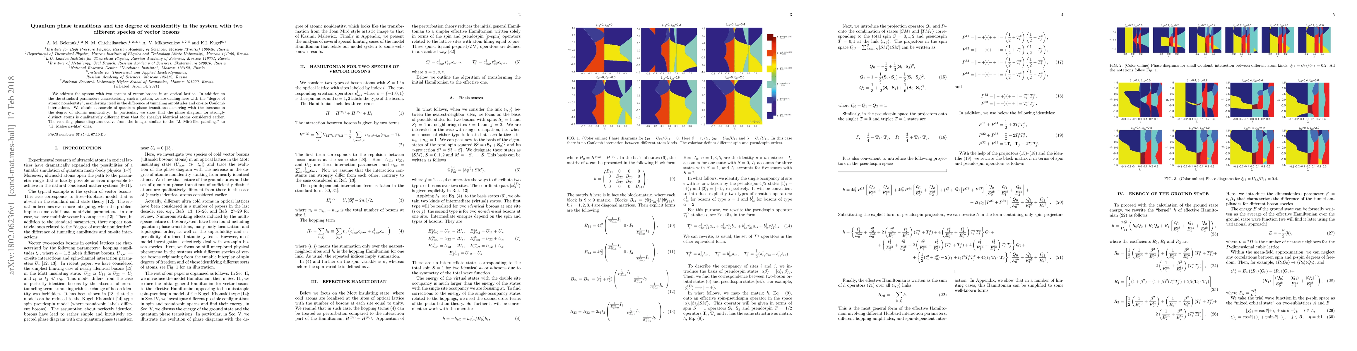 This paper investigates quantum phase transitions in a system of two species of vector bosons in an optical lattice, focusing on the "degree of atomic nonidentity" affecting tunneling and interactions. It reveals a cascade of quantum phase transitions with increasing nonidentity, resulting in a distinct phase diagram compared to nearly identical atoms, transitioning from "J. Miró-like" to "K. Malewicz-like" patterns.