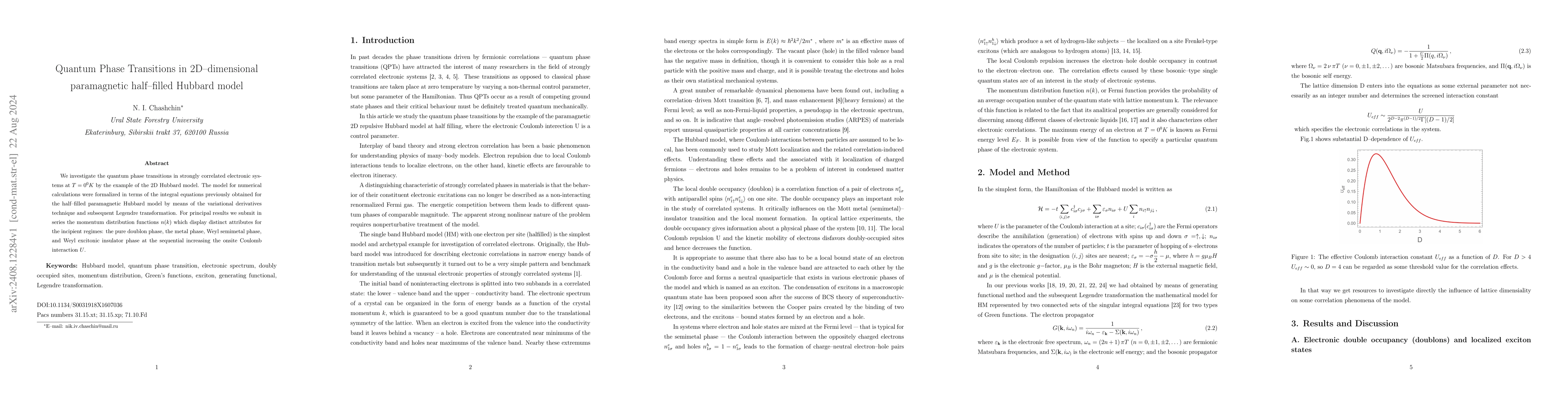 Summary: This research investigates quantum phase transitions in the 2D paramagnetic half-filled Hubbard model at zero temperature, employing integral equations and variational derivatives. The study highlights distinct momentum distribution functions marking phases such as doublon, metal, Weyl semimetal, and Weyl excitonic insulator as onsite interaction increases.