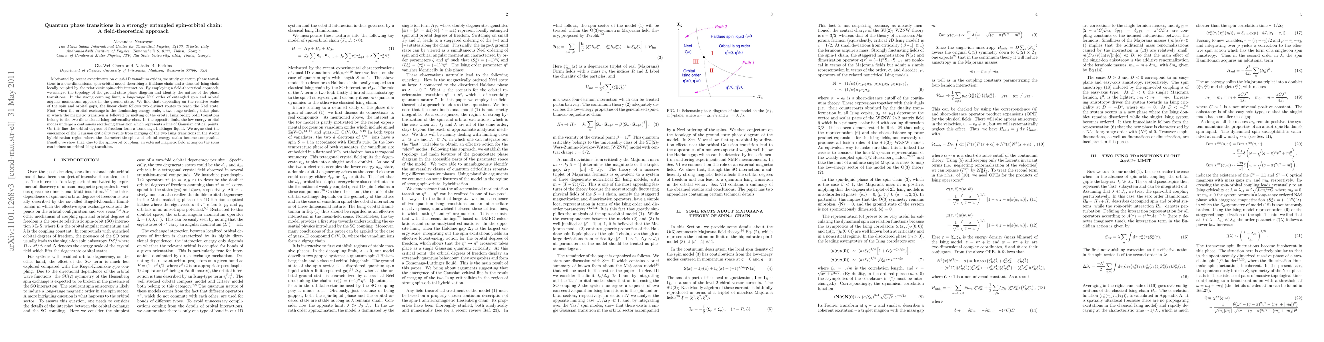 Motivated by recent experiments on quasi-1D vanadium oxides, we study quantum phase transitions in a one-dimensional spin-orbital model describing a Haldane chain and a classical Ising chain locally coupled by the relativistic spin-orbit interaction. By employing a field-theoretical approach, we analyze the topology of the ground-state phase diagram and identify the nature of the phase transitions. In the strong coupling limit, a long-range N\'eel order of entangled spin and orbital angular momentum appears in the ground state. We find that, depending on the relative scales of the spin and orbital gaps, the linear chain follows two distinct routes to reach the N\'eel state. First, when the orbital exchange is the dominating energy scale, a two-stage ordering takes place in which the magnetic transition is followed by melting of the orbital Ising order; both transitions belong to the two-dimensional Ising universality class. In the opposite limit, the low-energy orbital modes undergo a continuous reordering transition which represents a line of Gaussian critical points. On this line the orbital degrees of freedom form a Tomonaga-Luttinger liquid. We argue that the emergence of the Gaussian criticality results from merging of the two Ising transitions in the strong hybridization region where the characteristic spin and orbital energy scales become comparable. Finally, we show that, due to the spin-orbit coupling, an external magnetic field acting on the spins can induce an orbital Ising transition.