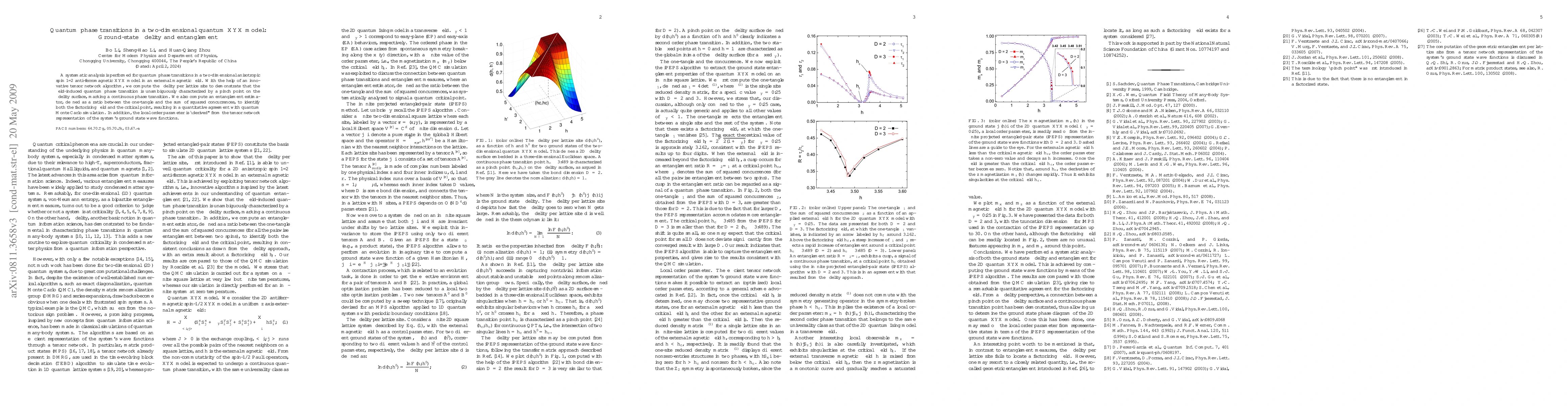A systematic analysis is performed for quantum phase transitions in a two-dimensional anisotropic spin 1/2 anti-ferromagnetic XYX model in an external magnetic field. With the help of an innovative tensor network algorithm, we compute the fidelity per lattice site to demonstrate that the field-induced quantum phase transition is unambiguously characterized by a pinch point on the fidelity surface, marking a continuous phase transition. We also compute an entanglement estimator, defined as a ratio between the one-tangle and the sum of squared concurrences, to identify both the factorizing field and the critical point, resulting in a quantitative agreement with quantum Monte Carlo simulation. In addition, the local order parameter is "derived" from the tensor network representation of the system's ground state wave functions.