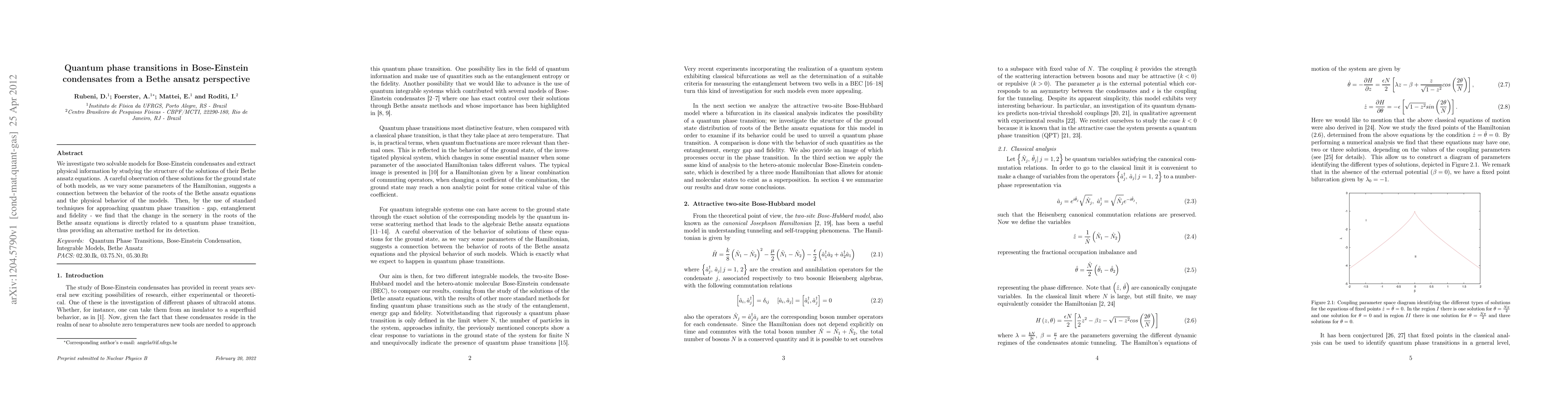 This paper explores two solvable models for Bose-Einstein condensates using Bethe ansatz equations, revealing a link between the roots' behavior and quantum phase transitions. It proposes an alternative method for detecting quantum phase transitions through the analysis of Bethe ansatz solutions.