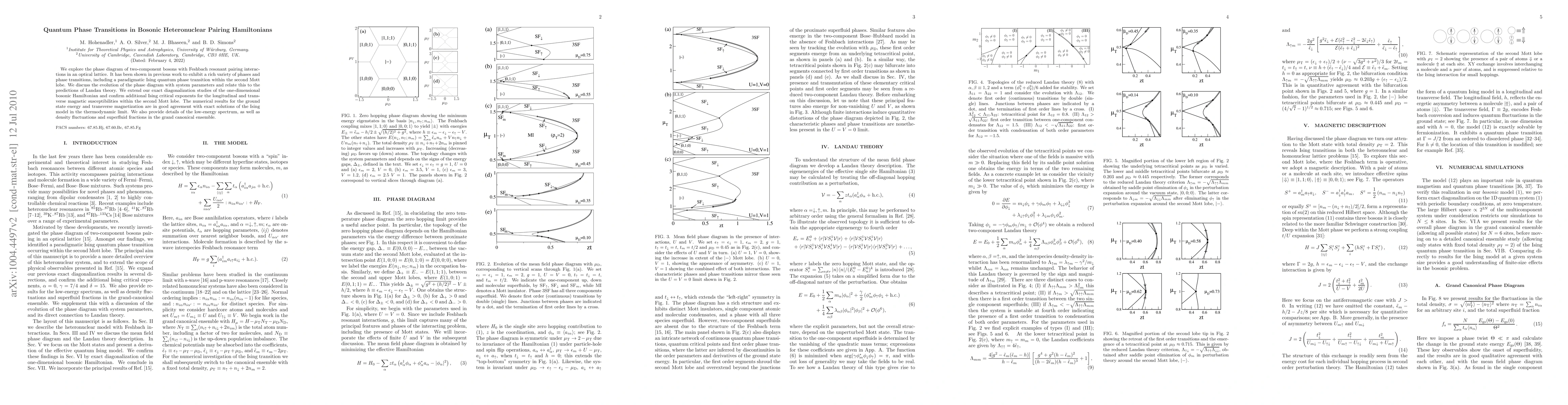 We explore the phase diagram of two-component bosons with Feshbach resonant pairing interactions in an optical lattice. It has been shown in previous work to exhibit a rich variety of phases and phase transitions, including a paradigmatic Ising quantum phase transition within the second Mott lobe. We discuss the evolution of the phase diagram with system parameters and relate this to the predictions of Landau theory. We extend our exact diagonalization studies of the one-dimensional bosonic Hamiltonian and confirm additional Ising critical exponents for the longitudinal and transverse magnetic susceptibilities within the second Mott lobe. The numerical results for the ground state energy and transverse magnetization are in good agreement with exact solutions of the Ising model in the thermodynamic limit. We also provide details of the low-energy spectrum, as well as density fluctuations and superfluid fractions in the grand canonical ensemble.