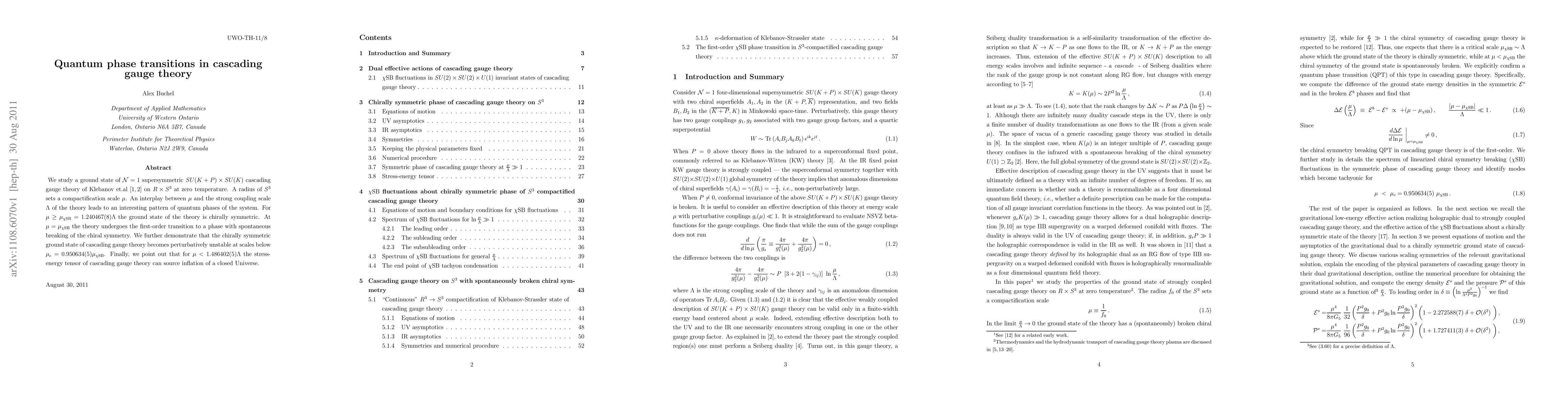 We study a ground state of N=1 supersymmetric SU(K+P) x SU(K) cascading gauge theory of Klebanov et.al [1,2] on R x S^3 at zero temperature. A radius of S^3 sets a compactification scale mu. An interplay between mu and the strong coupling scale Lambda of the theory leads to an interesting pattern of quantum phases of the system. For mu > mu_cSB=1.240467(8)Lambda the ground state of the theory is chirally symmetric. At mu=mu_cSB the theory undergoes the first-order transition to a phase with spontaneous breaking of the chiral symmetry. We further demonstrate that the chirally symmetric ground state of cascading gauge theory becomes perturbatively unstable at scales below mu_c=0.950634(5)mu_cSB. Finally, we point out that for mu < 1.486402(5)Lambda the stress-energy tensor of cascading gauge theory can source inflation of a closed Universe.